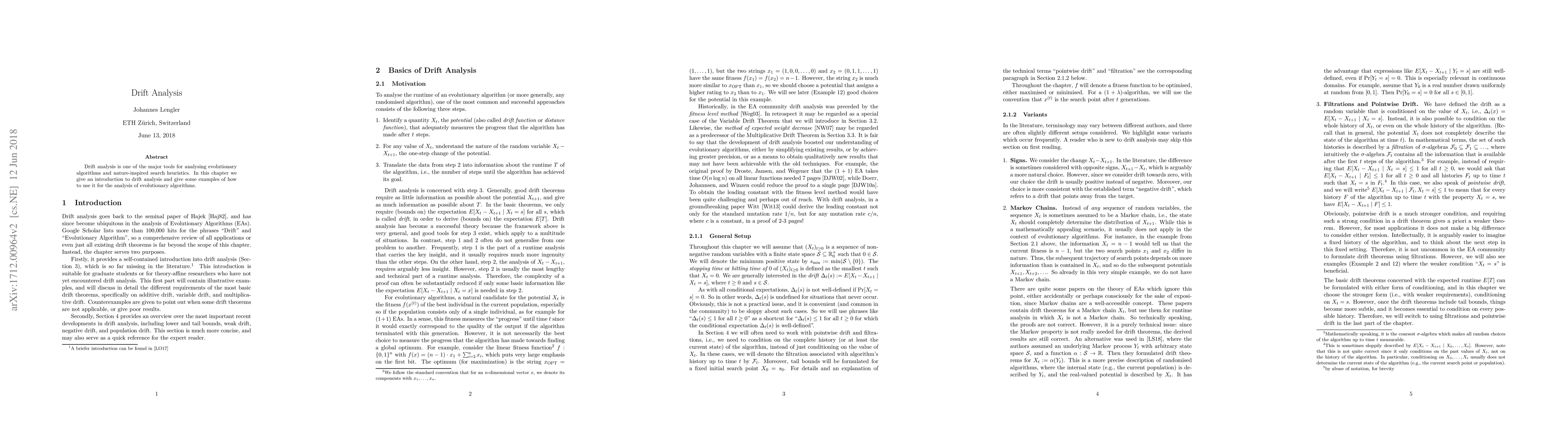 Drift analysis is one of the major tools for analysing evolutionary algorithms and nature-inspired search heuristics. In this chapter we give an introduction to drift analysis and give some examples of how to use it for the analysis of evolutionary algorithms.