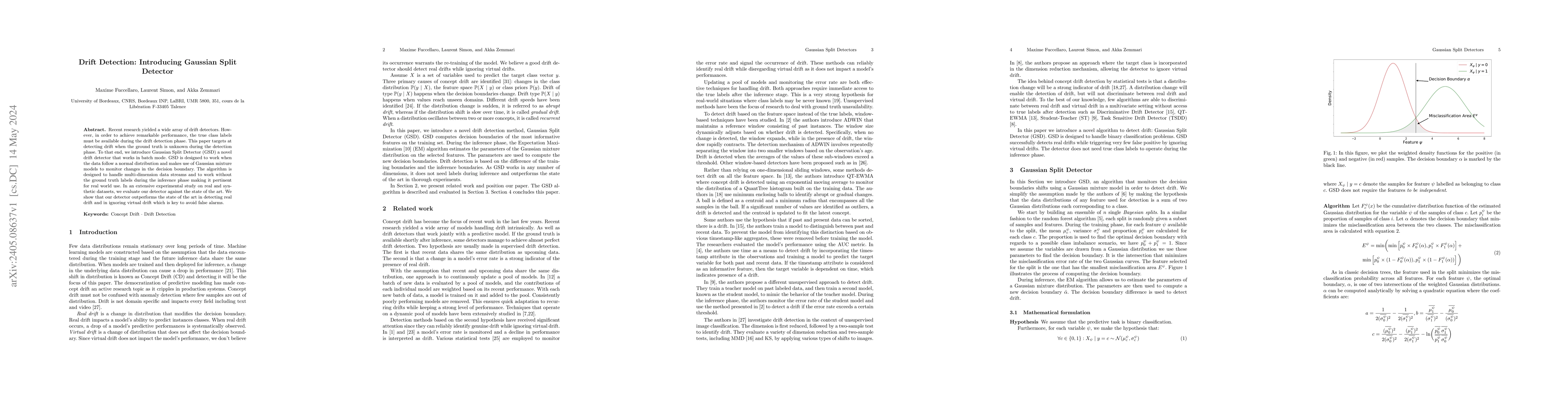 This paper introduces the Gaussian Split Detector (GSD), a novel drift detection algorithm designed to operate without requiring ground truth labels during inference, making it suitable for real-world applications. GSD leverages Gaussian mixture models to monitor changes in decision boundaries in normally distributed, multi-dimensional data streams, outperforming existing methods in detecting real drift while minimizing false alarms.