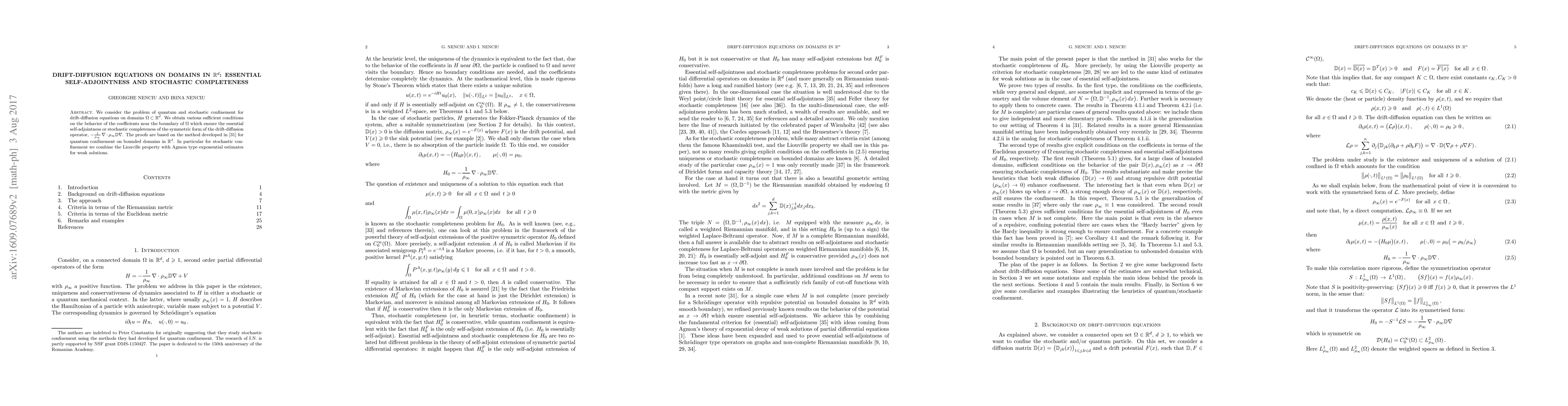 We consider the problem of quantum and stochastic confinement for drift-diffusion equations on domains $ \Omega \subset \mathbb R^d$. We obtain various sufficient conditions on the behavior of the coefficients near the boundary of $\Omega$ which ensure the essential self-adjointness or stochastic completeness of the symmetric form of the drift-diffusion operator, $-\frac{1}{\rho_\infty}\,\nabla\cdot \rho_\infty\mathbb D\nabla$. The proofs are based on the method developed in [29] for quantum confinement on bounded domains in $\mathbb R^d$. In particular for stochastic confinement we combine the Liouville property with Agmon type exponential estimates for weak solutions.