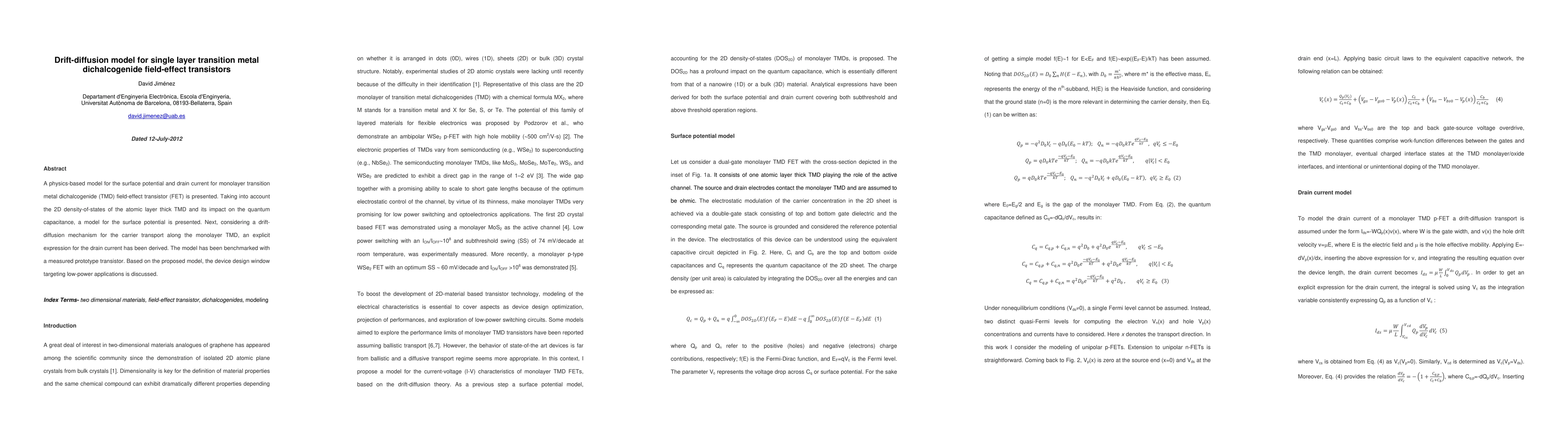 This paper presents a physics-based drift-diffusion model for monolayer transition metal dichalcogenide (TMD) field-effect transistors, incorporating the 2D density-of-states and quantum capacitance. The model is validated against a prototype and discusses design implications for low-power applications.