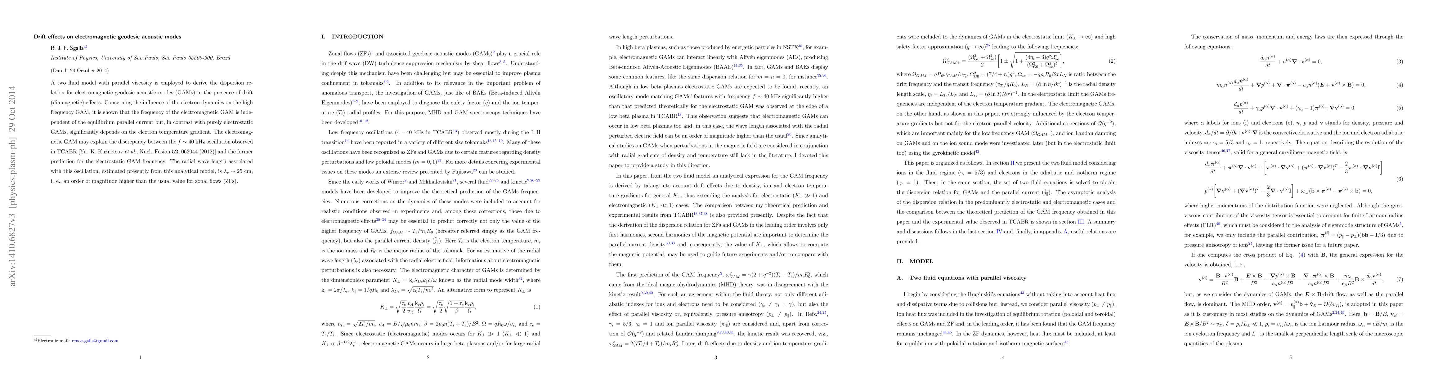 A two fluid model with parallel viscosity is employed to derive the dispersion relation for electromagnetic geodesic acoustic modes (GAMs) in the presence of drift (diamagnetic) effects. Concerning the influence of the electron dynamics on the high frequency GAM, it is shown that the frequency of the electromagnetic GAM is independent of the equilibrium parallel current but, in contrast with purely electrostatic GAMs, significantly depends on the electron temperature gradient. The electromagnetic GAM may explain the discrepancy between the $f\sim 40$ kHz oscillation observed in TCABR [Yu. K. Kuznetsov $\textit{et al.}$, Nucl. Fusion $\bf{52}$, 063044 (2012)] and the former prediction for the electrostatic GAM frequency. The radial wave length associated with this oscillation, estimated presently from this analytical model, is $\lambda_r\sim 25$ cm, i. e., an order of magnitude higher than the usual value for zonal flows (ZFs).
