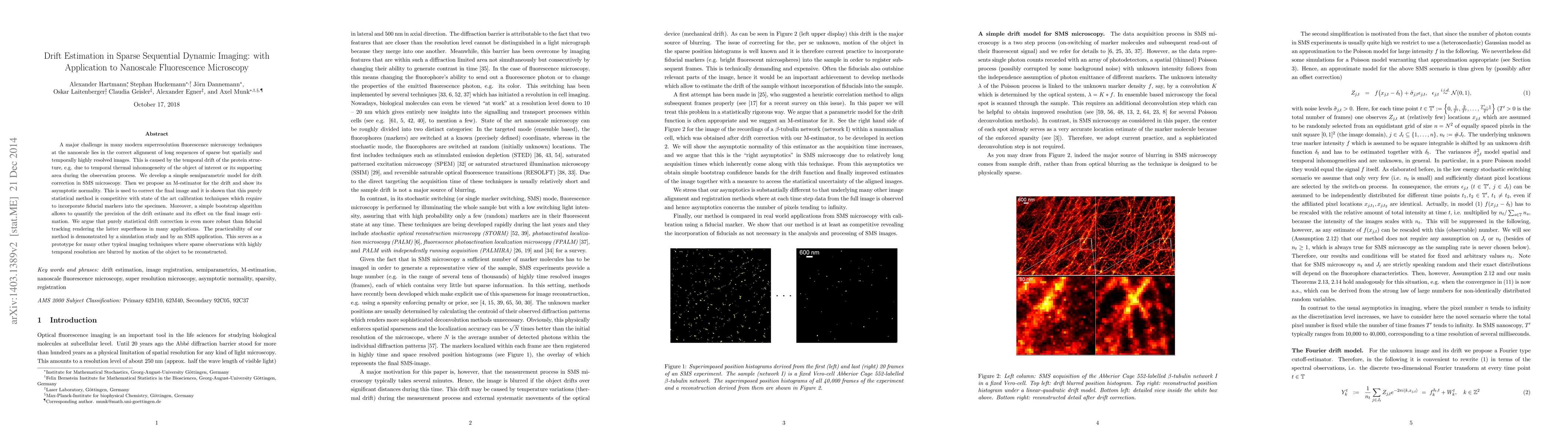 A major challenge in many modern superresolution fluorescence microscopy techniques at the nanoscale lies in the correct alignment of long sequences of sparse but spatially and temporally highly resolved images. This is caused by the temporal drift of the protein structure, e.g. due to temporal thermal inhomogeneity of the object of interest or its supporting area during the observation process. We develop a simple semiparametric model for drift correction in SMS microscopy. Then we propose an M-estimator for the drift and show its asymptotic normality. This is used to correct the final image and it is shown that this purely statistical method is competitive with state of the art calibration techniques which require to incorporate fiducial markers into the specimen. Moreover, a simple bootstrap algorithm allows to quantify the precision of the drift estimate and its effect on the final image estimation. We argue that purely statistical drift correction is even more robust than fiducial tracking rendering the latter superfluous in many applications. The practicability of our method is demonstrated by a simulation study and by an SMS application. This serves as a prototype for many other typical imaging techniques where sparse observations with highly temporal resolution are blurred by motion of the object to be reconstructed.