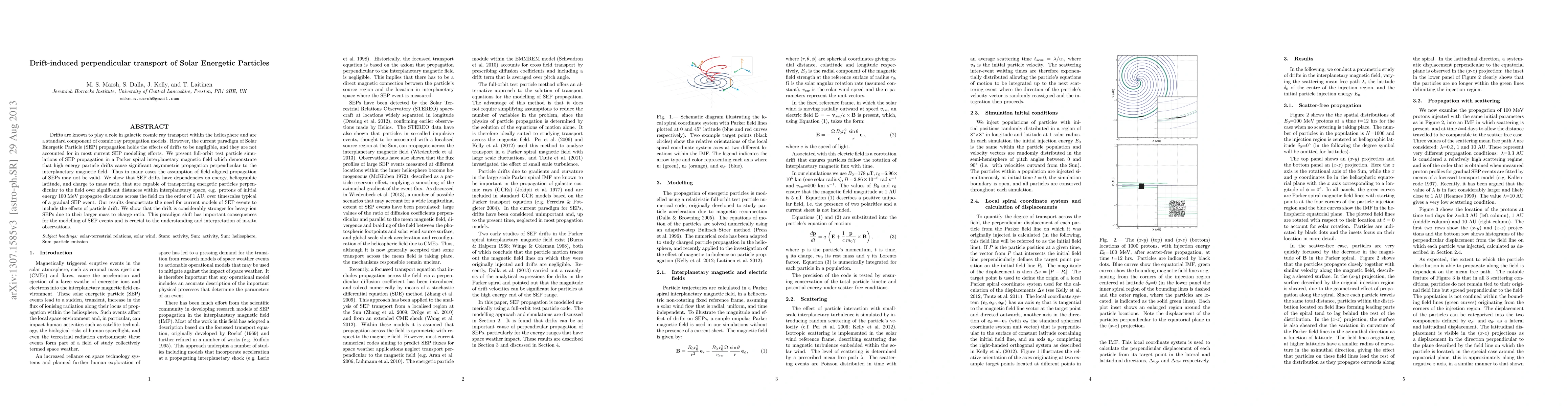 This paper demonstrates that drifts significantly influence the perpendicular transport of Solar Energetic Particles (SEPs) in the heliosphere, challenging the current assumption of field-aligned propagation. The simulations reveal that drifts, dependent on energy, latitude, and charge-to-mass ratio, can transport energetic particles over large distances, such as 100 MeV protons across 1 AU, necessitating the inclusion of drift effects in SEP models.
