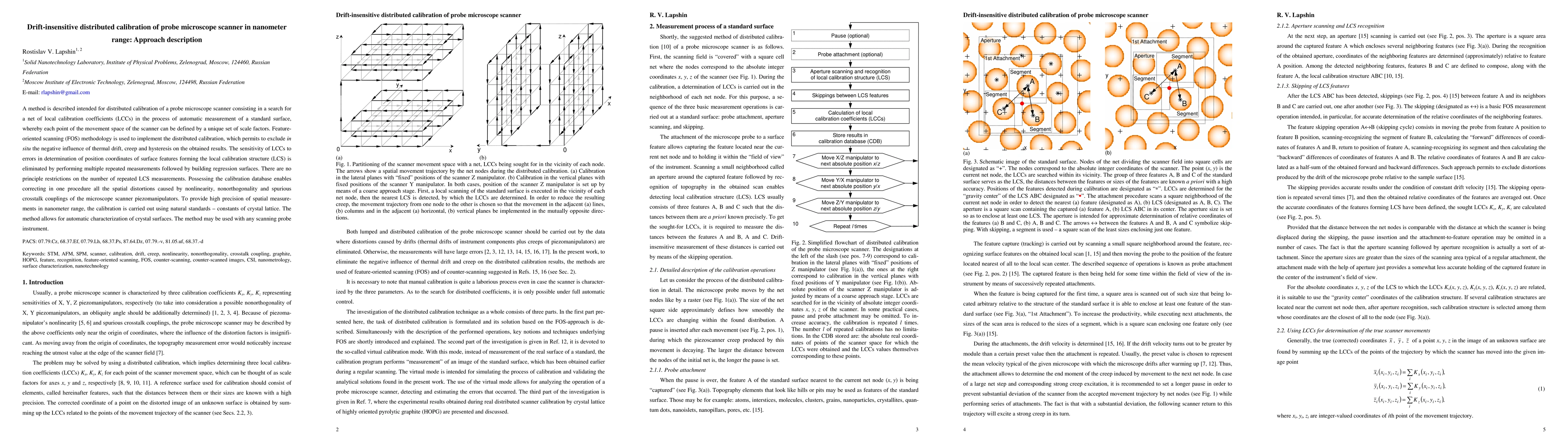 This paper presents a method for distributed calibration of probe microscope scanners, utilizing feature-oriented scanning to minimize thermal drift, creep, and hysteresis effects. The approach employs natural crystal lattice constants for precise nanometer-scale measurements and builds regression surfaces from multiple measurements to enhance accuracy.