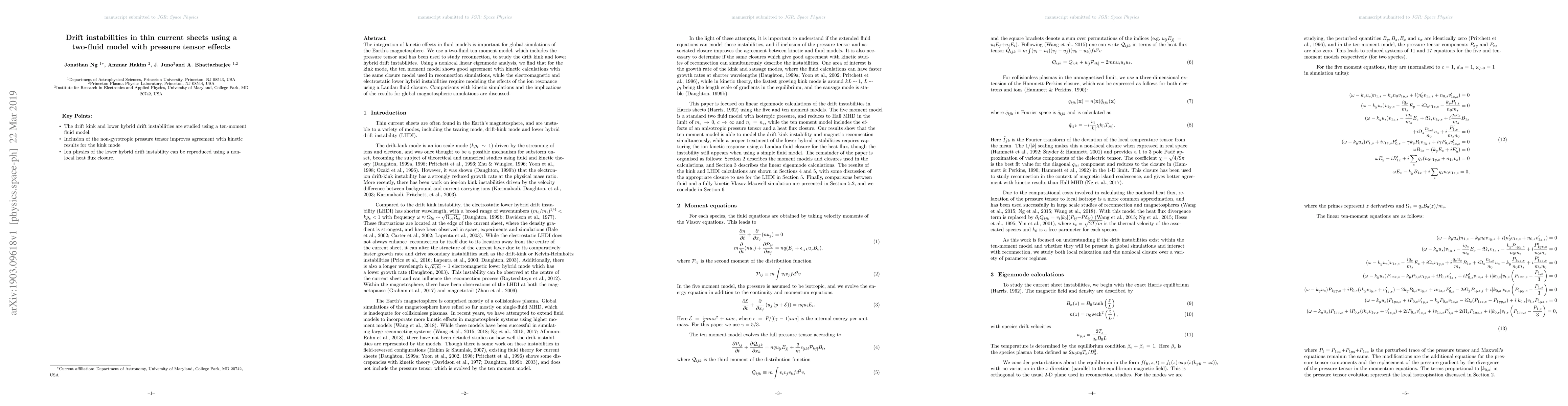 This paper investigates drift instabilities in thin current sheets using a two-fluid ten moment model that incorporates pressure tensor effects. The study finds good agreement between the model and kinetic calculations for the drift kink mode, while the lower hybrid drift instability necessitates a Landau fluid closure to accurately model ion resonance effects.