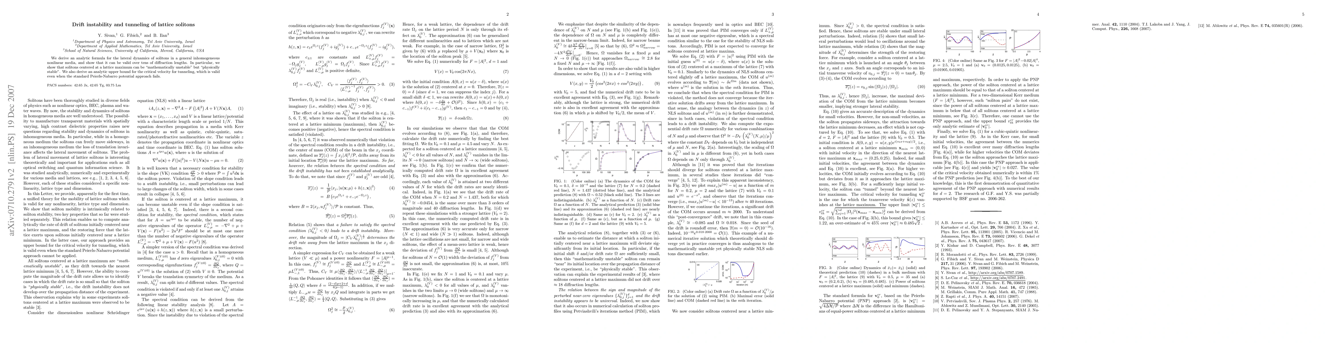 We derive an analytic formula for the lateral dynamics of solitons in a general inhomogeneous nonlinear media, and show that it can be valid over tens of diffraction lengths. In particular, we show that solitons centered at a lattice maximum can be ``mathematically unstable'' but ``physically stable''. We also derive an analytic upper bound for the critical velocity for tunneling, which is valid even when the standard Peierls-Nabarro potential approach fails.