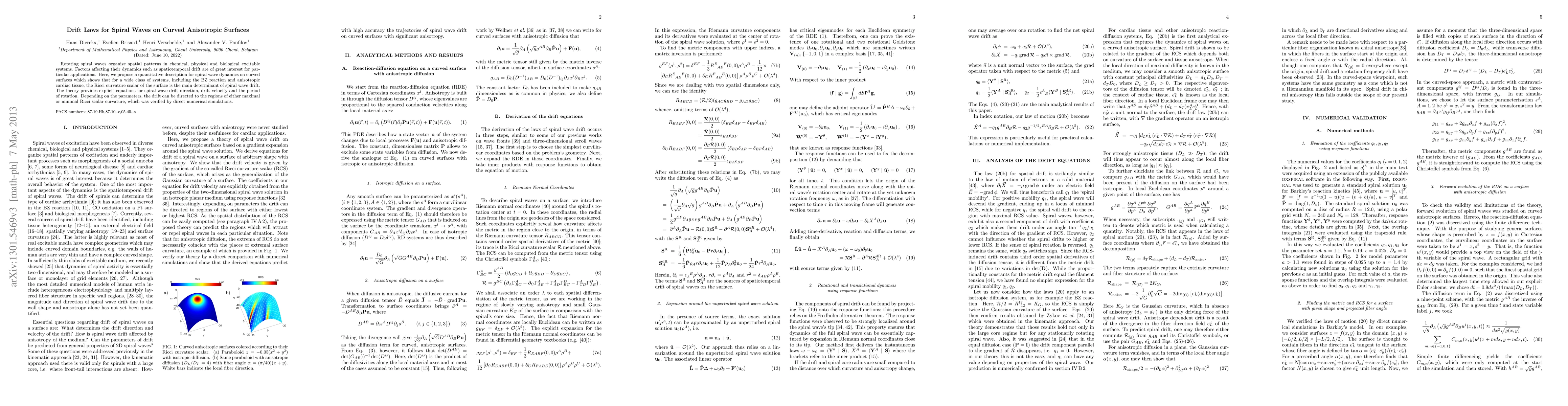 This paper proposes a quantitative framework for understanding the dynamics of rotating spiral waves on curved anisotropic surfaces, demonstrating that the Ricci curvature scalar primarily dictates spiral wave drift. The theory offers explicit equations for drift direction, velocity, and rotation period, validated through numerical simulations.