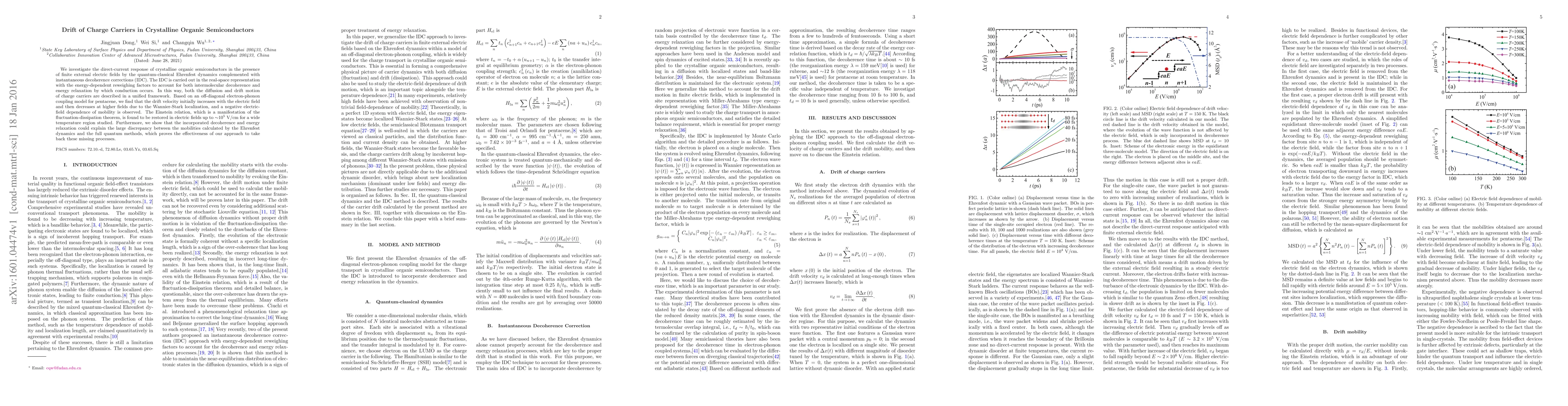 The research employs quantum-classical Ehrenfest dynamics with instantaneous decoherence corrections (IDC) to study the direct-current response of crystalline organic semiconductors under external electric fields. The IDC accounts for intermolecular decoherence and energy relaxation, enabling a unified description of both diffusion and drift motion.