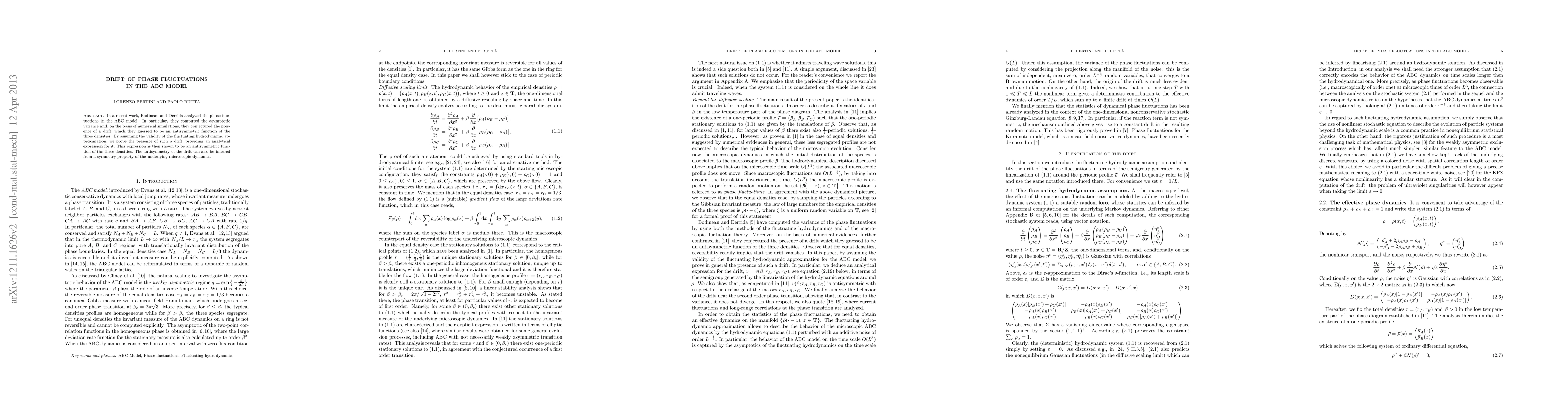 In a recent work, Bodineau and Derrida analyzed the phase fluctuations in the ABC model. In particular, they computed the asymptotic variance and, on the basis of numerical simulations, they conjectured the presence of a drift, which they guessed to be an antisymmetric function of the three densities. By assuming the validity of the fluctuating hydrodynamic approximation, we prove the presence of such a drift, providing an analytical expression for it. This expression is then shown to be an antisymmetric function of the three densities. The antisymmetry of the drift can also be inferred from a symmetry property of the underlying microscopic dynamics.