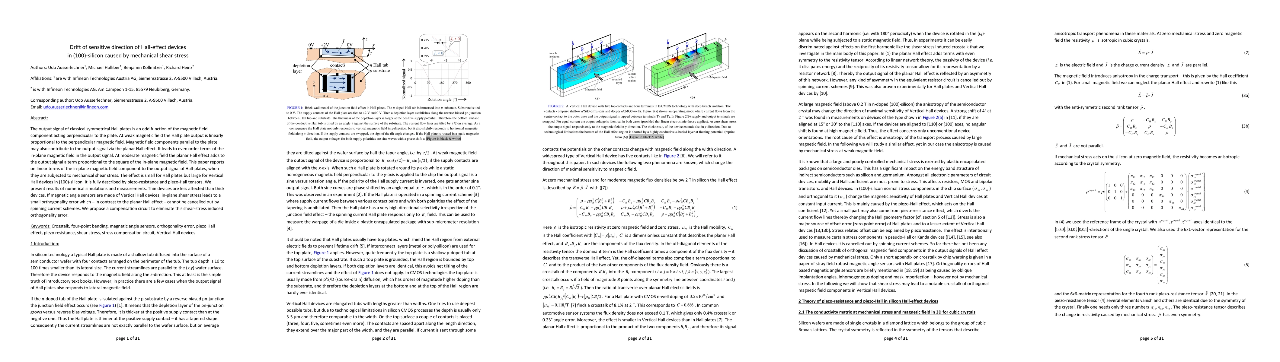 This paper investigates the influence of mechanical shear stress on the sensitive direction of Hall-effect devices in (100)-silicon, finding significant effects in Vertical Hall devices. It proposes a compensation circuit to mitigate the resulting orthogonality error from in-plane shear stress, which cannot be corrected by spinning current methods.