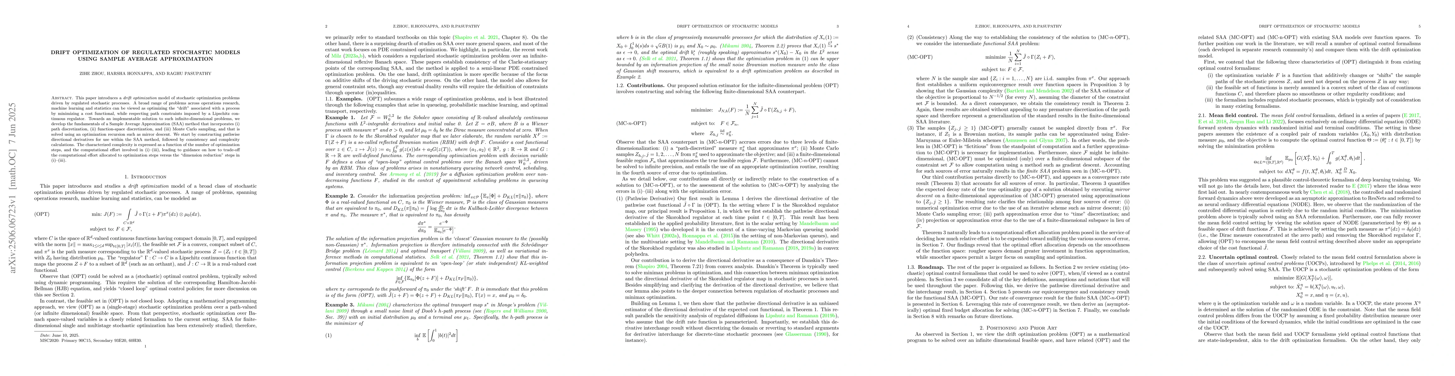 This paper presents a novel drift optimization model for stochastic problems using a Sample Average Approximation (SAA) method. It outlines a process involving path and function-space discretization, Monte Carlo sampling, and optimization recursion, providing a framework for solving complex, infinite-dimensional problems across various fields.