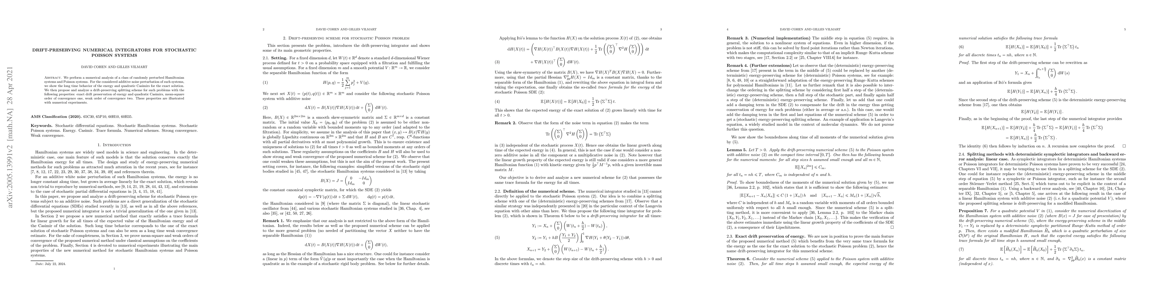 We perform a numerical analysis of a class of randomly perturbed {H}amiltonian systems and {P}oisson systems. For the considered additive noise perturbation of such systems, we show the long time behavior of the energy and quadratic Casimirs for the exact solution. We then propose and analyze a drift-preserving splitting scheme for such problems with the following properties: exact drift preservation of energy and quadratic Casimirs, mean-square order of convergence one, weak order of convergence two. These properties are illustrated with numerical experiments.