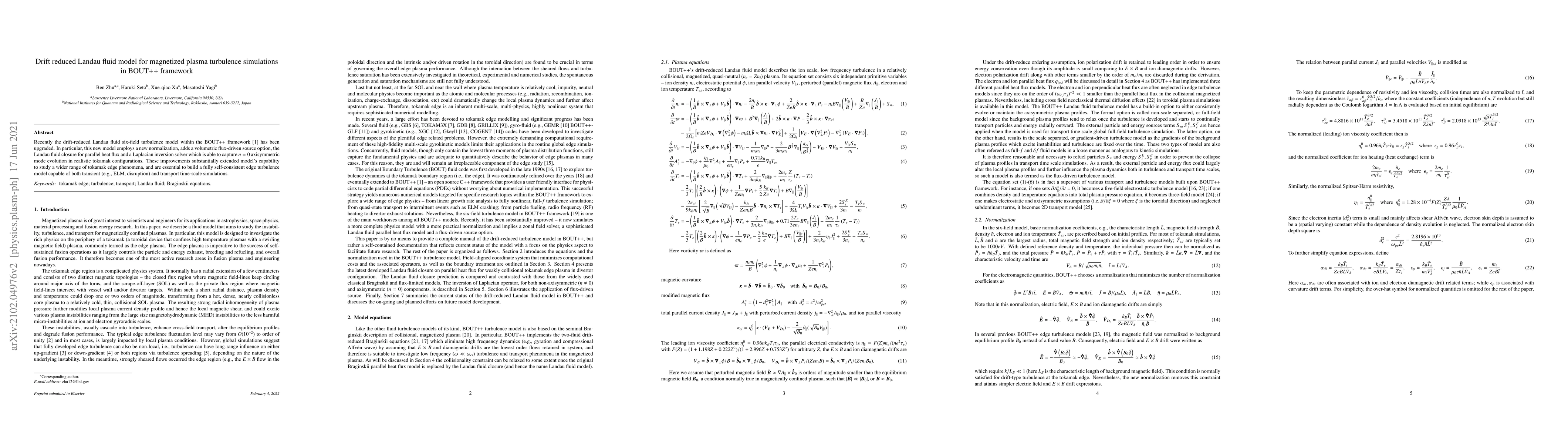 Recently the drift-reduced Landau fluid six-field turbulence model within the BOUT++ framework has been upgraded. In particular, this new model employs a new normalization, adds a volumetric flux-driven source option, the Landau fluid closure for parallel heat flux and a Laplacian inversion solver which is able to capture n=0 axisymmetric mode evolution in realistic tokamak configurations. These improvements substantially extended model's capability to study a wider range of tokamak edge phenomena, and are essential to build a fully self-consistent edge turbulence model capable of both transient (e.g., ELM, disruption) and transport time-scale simulations.