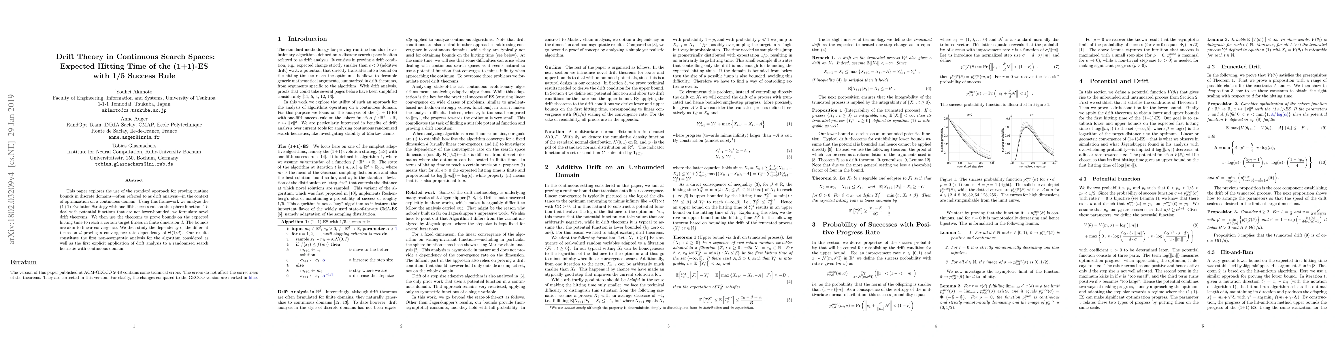 This paper analyzes the expected hitting time of the (1+1)-ES algorithm on a continuous domain using drift theory, finding linear convergence rates of θ(1/d) for target fitness in finite dimensions d.