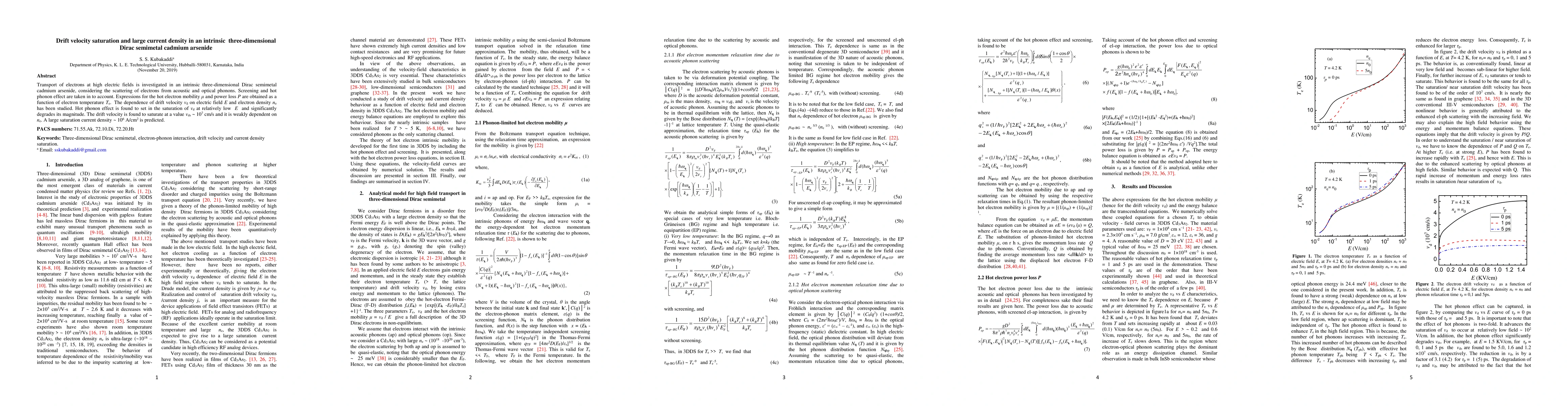 This paper investigates the electron transport in cadmium arsenide under high electric fields, revealing the saturation of drift velocity due to hot phonon effects at low electric fields. The study predicts a large saturation current density of approximately 10^6 A/cm² despite weak dependence on electron density.