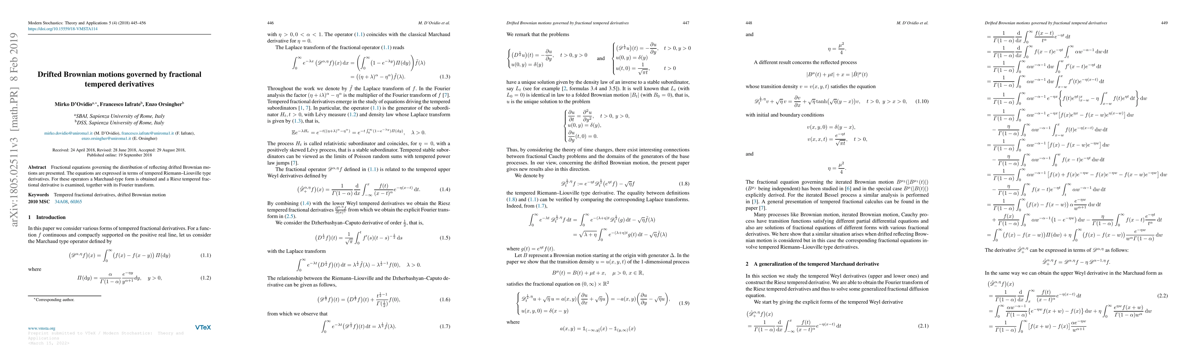 Fractional equations governing the distribution of reflecting drifted Brownian motions are presented. The equations are expressed in terms of tempered Riemann--Liouville type derivatives. For these operators a Marchaud-type form is obtained and a Riesz tempered fractional derivative is examined, together with its Fourier transform.