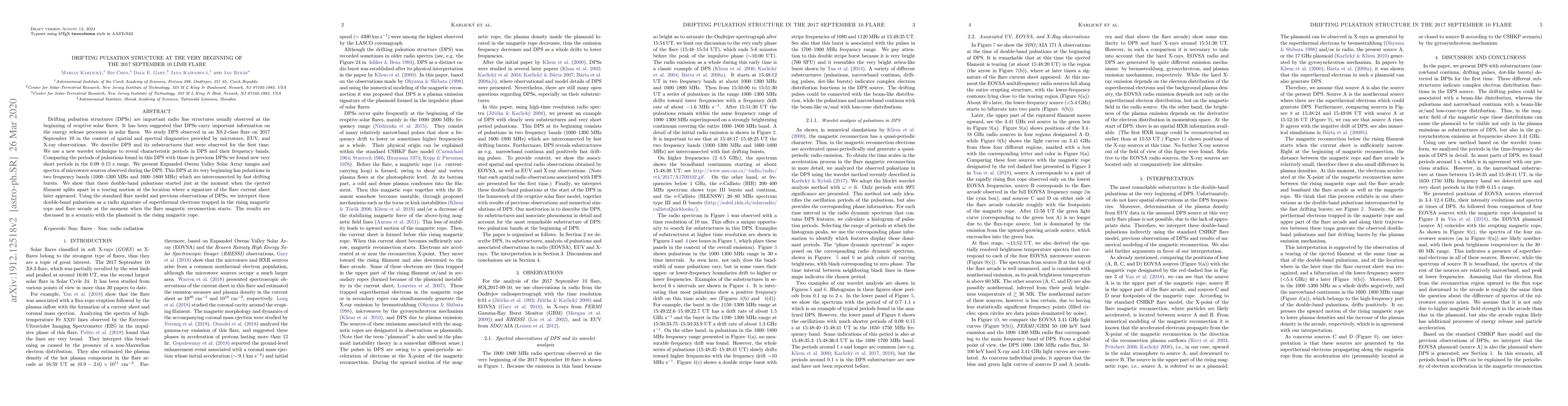 Drifting pulsation structures (DPSs) are important radio fine structures usually observed at the beginning of eruptive solar flares. It has been suggested that DPSs carry important information on the energy release processes in solar flares. We study DPS observed in an X8.2-class flare on 2017 September 10 in the context of spatial and spectral diagnostics provided by microwave, EUV, and X-ray observations. We describe DPS and its sub-structures that were observed for the first time. We use a new wavelet technique to reveal characteristic periods in DPS and their frequency bands. Comparing the periods of pulsations found in this DPS with those in previous DPSs we found new very short periods in the 0.09-0.15 s range. We present EOVSA images and spectra of microwave sources observed during the DPS. This DPS at its very beginning has pulsations in two frequency bands (1000-1300 MHz and 1600--1800 MHz) which are interconnected by fast drifting bursts. We show that these double-band pulsations started just at the moment when the ejected filament splits apart in a tearing motion at the location where a signature of the flare current sheetlater appeared. Using the standard flare model and previous observations of DPSs, we interpret these double-band pulsations as a radio signature of superthermal electrons trapped in the rising magnetic rope and flare arcade at the moment when the flare magnetic reconnection starts. The results are discussed in a scenario with the plasmoid in the rising magnetic rope.