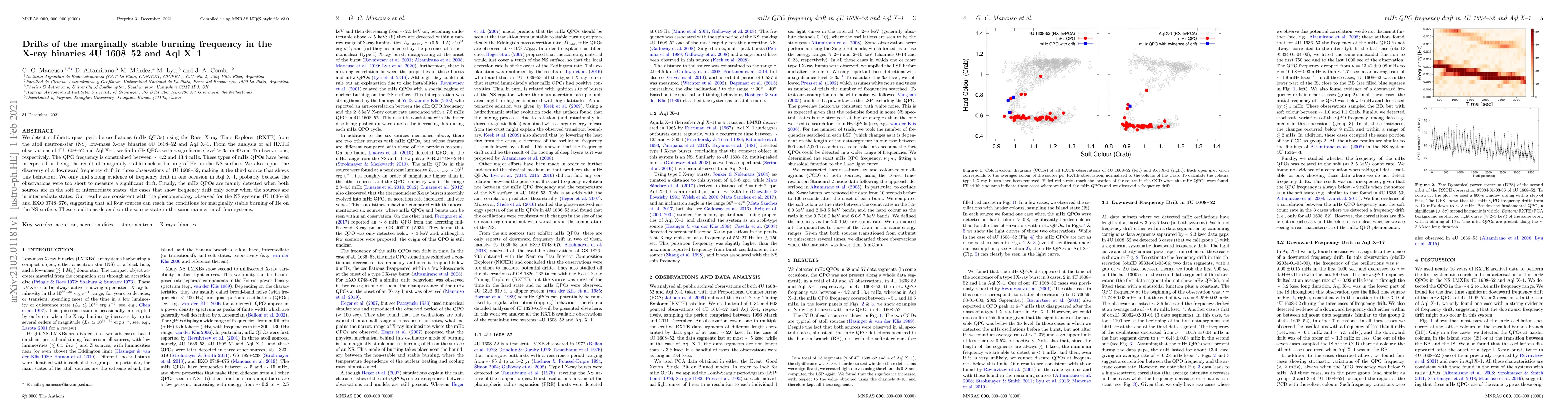 This study identifies millihertz quasi-periodic oscillations (mHz QPOs) in neutron-star low-mass X-ray binaries 4U 1608--52 and Aql X--1, interpreted as evidence of marginally stable nuclear burning of He on their surfaces. The researchers detected significant mHz QPOs in 49 and 47 observations, respectively, and observed frequency drifts in some instances, suggesting consistent phenomenology across similar neutron-star systems.