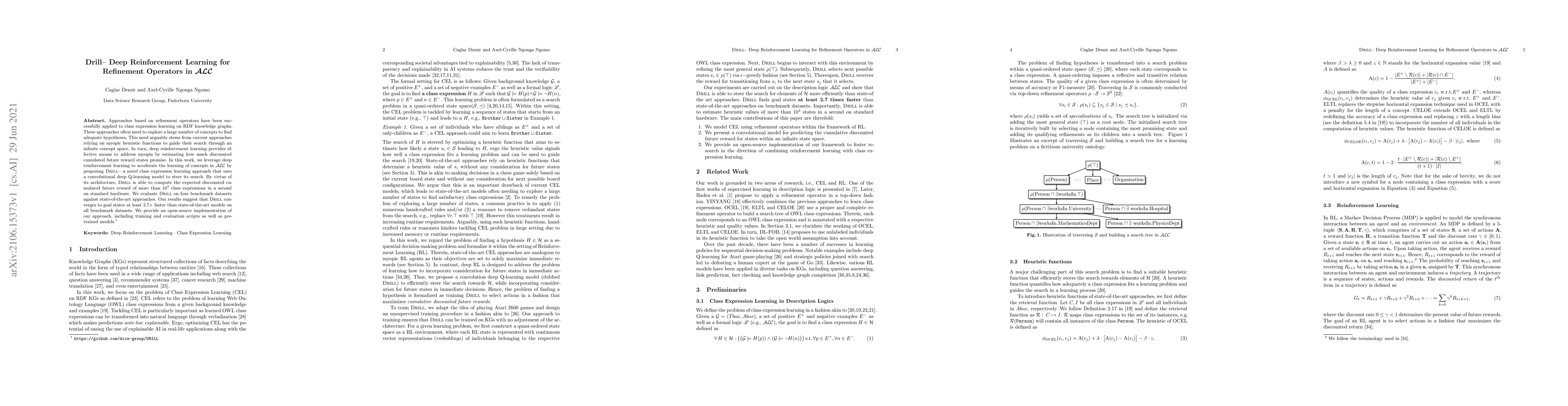 Approaches based on refinement operators have been successfully applied to class expression learning on RDF knowledge graphs. These approaches often need to explore a large number of concepts to find adequate hypotheses. This need arguably stems from current approaches relying on myopic heuristic functions to guide their search through an infinite concept space. In turn, deep reinforcement learning provides effective means to address myopia by estimating how much discounted cumulated future reward states promise. In this work, we leverage deep reinforcement learning to accelerate the learning of concepts in $\mathcal{ALC}$ by proposing DRILL -- a novel class expression learning approach that uses a convolutional deep Q-learning model to steer its search. By virtue of its architecture, DRILL is able to compute the expected discounted cumulated future reward of more than $10^3$ class expressions in a second on standard hardware. We evaluate DRILL on four benchmark datasets against state-of-the-art approaches. Our results suggest that DRILL converges to goal states at least 2.7$\times$ faster than state-of-the-art models on all benchmark datasets. We provide an open-source implementation of our approach, including training and evaluation scripts as well as pre-trained models.
