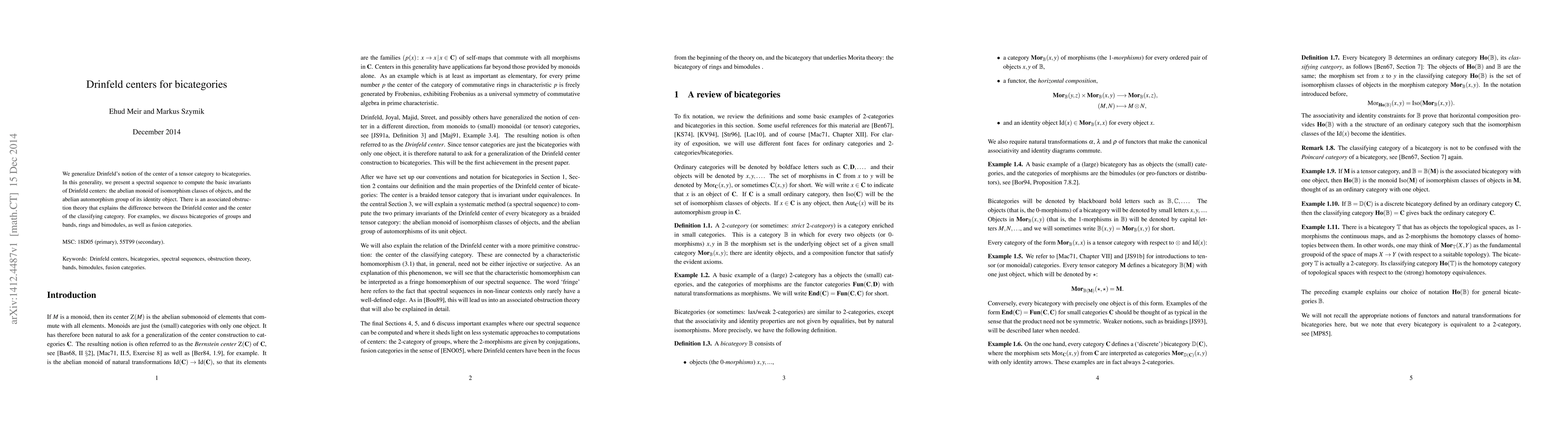 This paper extends Drinfeld's center concept to bicategories, introducing a spectral sequence for computing basic invariants and an associated obstruction theory. Examples include bicategories of groups, rings, and fusion categories.