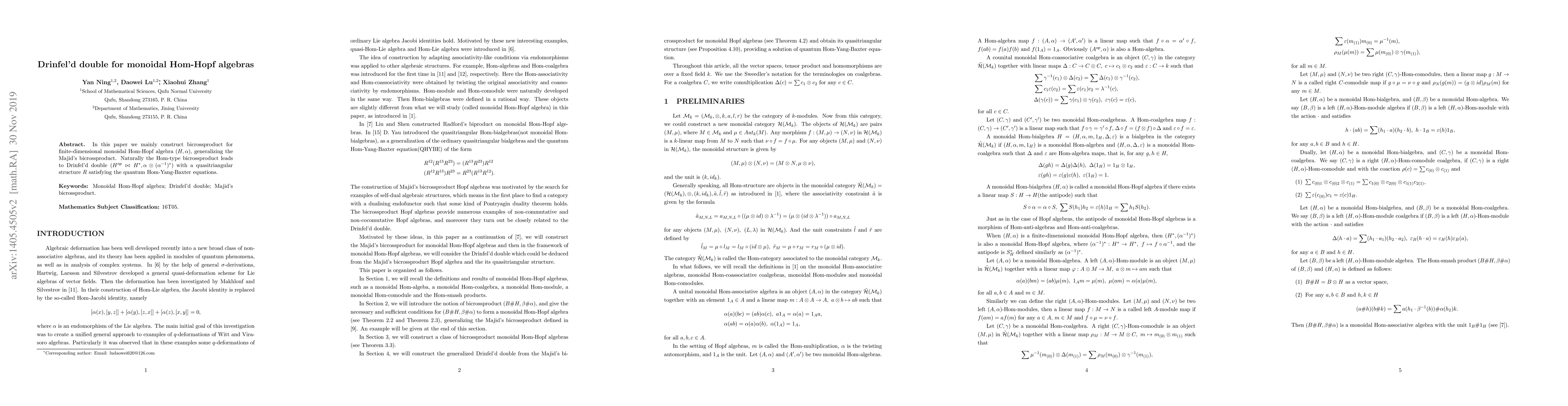 In this paper we mainly construct bicrossproduct for finite-dimensional monoidal Hom-Hopf algebra $(H,\alpha)$, generalizing the Majid's bicrossproduct. Naturally the Hom-type bicrossproduct leads to Drinfel'd double $(H^{op}\bowtie H^{\ast}, \alpha \otimes (\alpha^{-1})^\ast)$ with a quasitriangular structure $R$ satisfying the quantum Hom-Yang-Baxter equations.