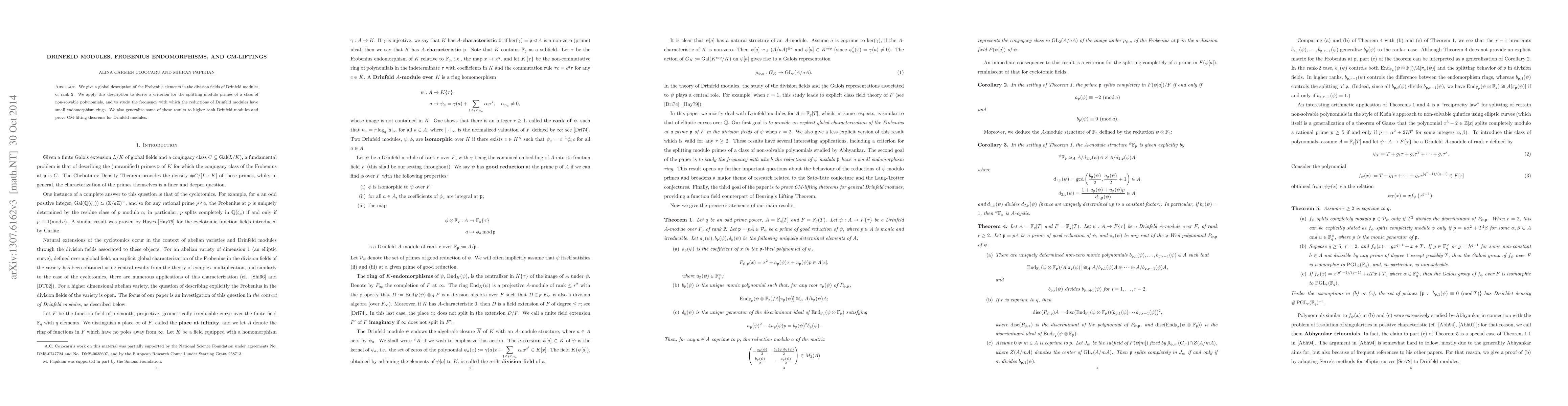 We give a global description of the Frobenius elements in the division fields of Drinfeld modules of rank $2$. We apply this description to derive a criterion for the splitting modulo primes of a class of non-solvable polynomials, and to study the frequency with which the reductions of Drinfeld modules have small endomorphism rings. We also generalize some of these results to higher rank Drinfeld modules and prove CM-lifting theorems for Drinfeld modules.