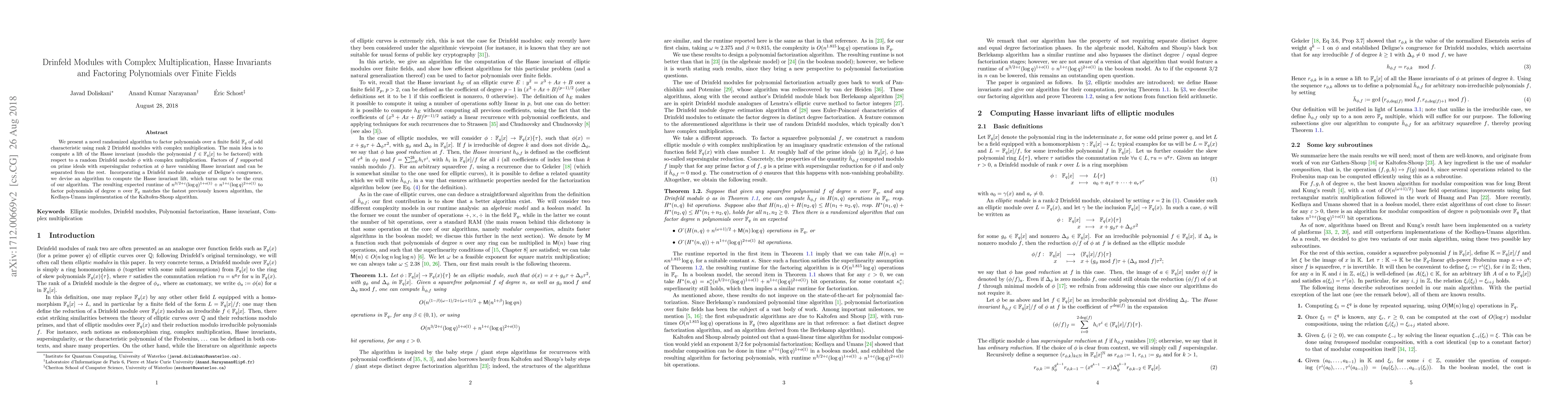 This paper introduces a randomized algorithm to factor polynomials over finite fields using rank 2 Drinfeld modules with complex multiplication. The algorithm hinges on computing a lift of the Hasse invariant to identify and separate polynomial factors supported by supersingular prime ideals.