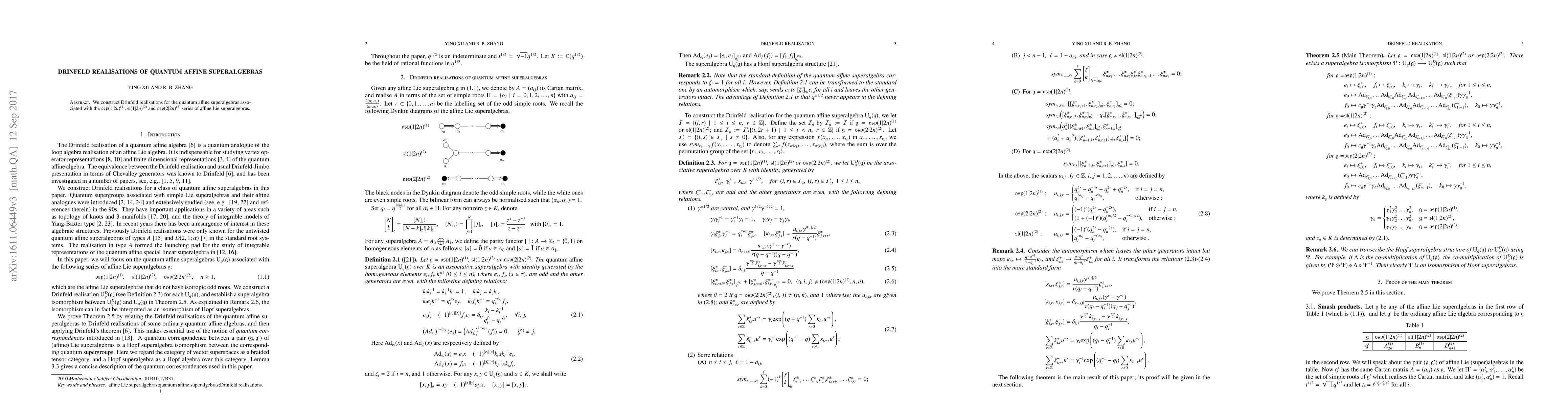 This paper constructs Drinfeld realisations for quantum affine superalgebras related to specific series of affine Lie superalgebras, including osp(1|2n)^{(1)}, Sl(1|2n)^{(2)}, and osp(2|2n)^{(2)}. These realisations provide a foundational framework for further study in quantum affine superalgebra theory.