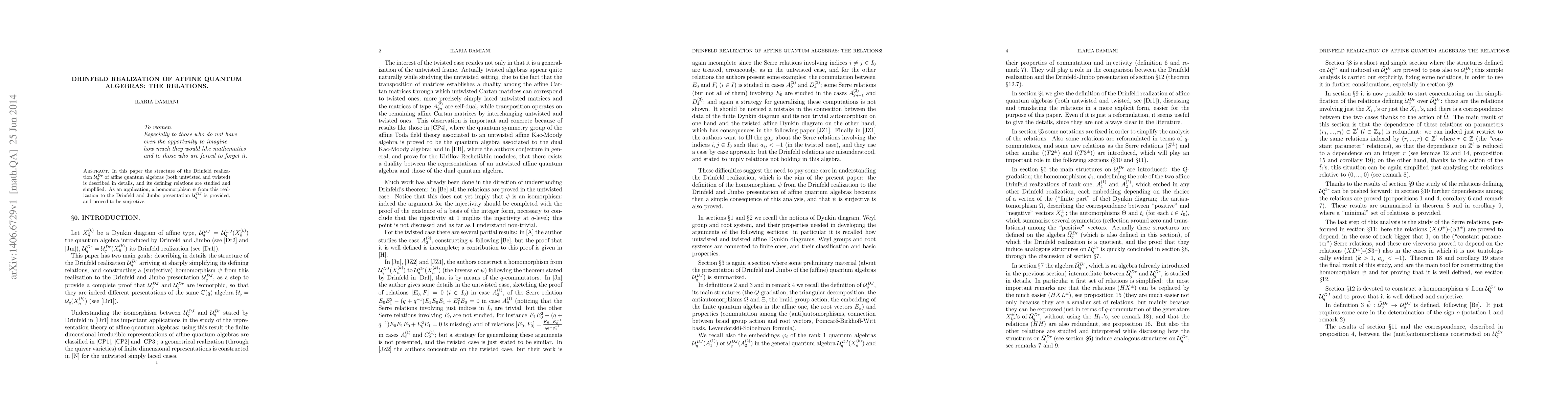 This paper details the structure and defining relations of the Drinfeld realization $\Udr_q$ of affine quantum algebras, simplifying them and providing a surjective homomorphism $\psi$ from $\Udr_q$ to the Drinfeld and Jimbo presentation $\U_q^{DJ}$.