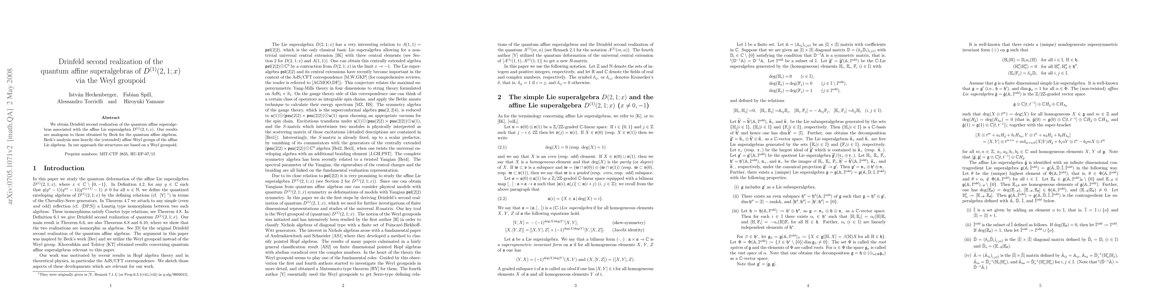 We obtain Drinfeld second realization of the quantum affine superalgebras associated with the affine Lie superalgebra $D^{(1)}(2,1;x)$. Our results are analogous to those obtained by Beck for the quantum affine algebras. Beck's analysis uses heavily the (extended) affine Weyl groups of the affine Lie algebras. In our approach the structures are based on a Weyl groupoid.