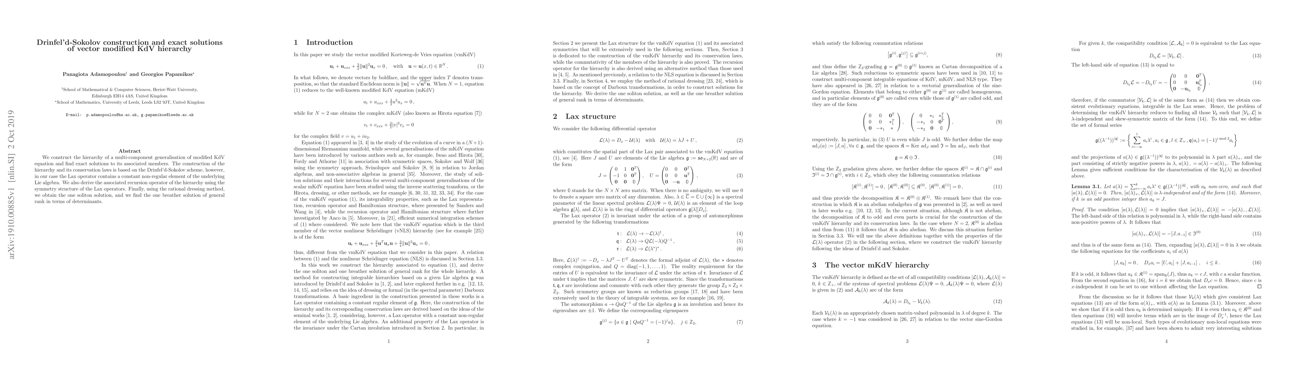 Researchers developed a method to solve a complex math problem known as the vector modified KdV hierarchy using the Drinfel'd-Sokolov scheme, leading to exact solutions for soliton and breather equations.