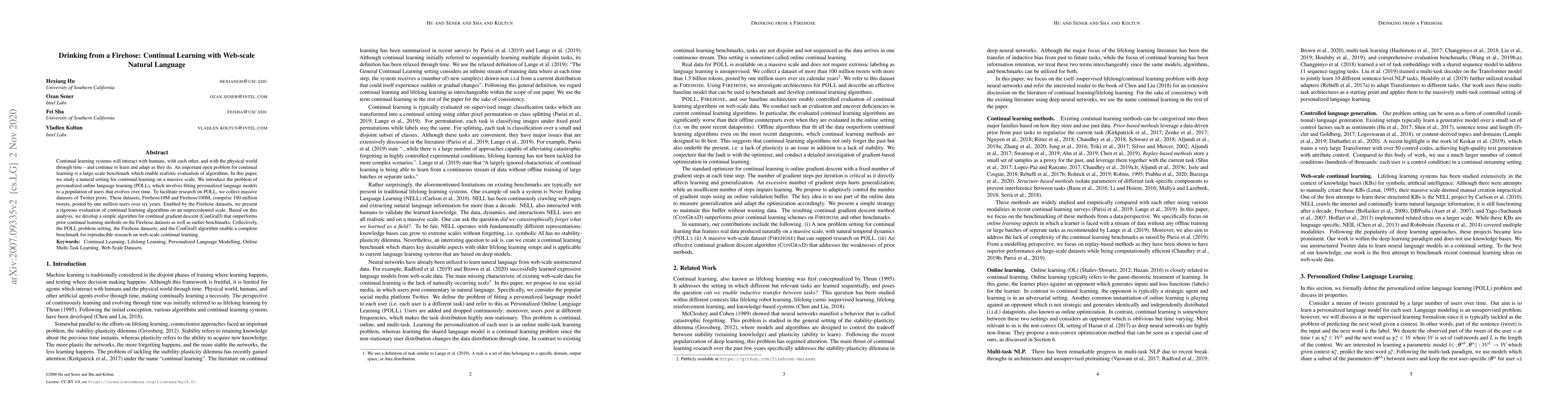 Continual learning systems will interact with humans, with each other, and with the physical world through time -- and continue to learn and adapt as they do. An important open problem for continual learning is a large-scale benchmark that enables realistic evaluation of algorithms. In this paper, we study a natural setting for continual learning on a massive scale. We introduce the problem of personalized online language learning (POLL), which involves fitting personalized language models to a population of users that evolves over time. To facilitate research on POLL, we collect massive datasets of Twitter posts. These datasets, Firehose10M and Firehose100M, comprise 100 million tweets, posted by one million users over six years. Enabled by the Firehose datasets, we present a rigorous evaluation of continual learning algorithms on an unprecedented scale. Based on this analysis, we develop a simple algorithm for continual gradient descent (ConGraD) that outperforms prior continual learning methods on the Firehose datasets as well as earlier benchmarks. Collectively, the POLL problem setting, the Firehose datasets, and the ConGraD algorithm enable a complete benchmark for reproducible research on web-scale continual learning.
