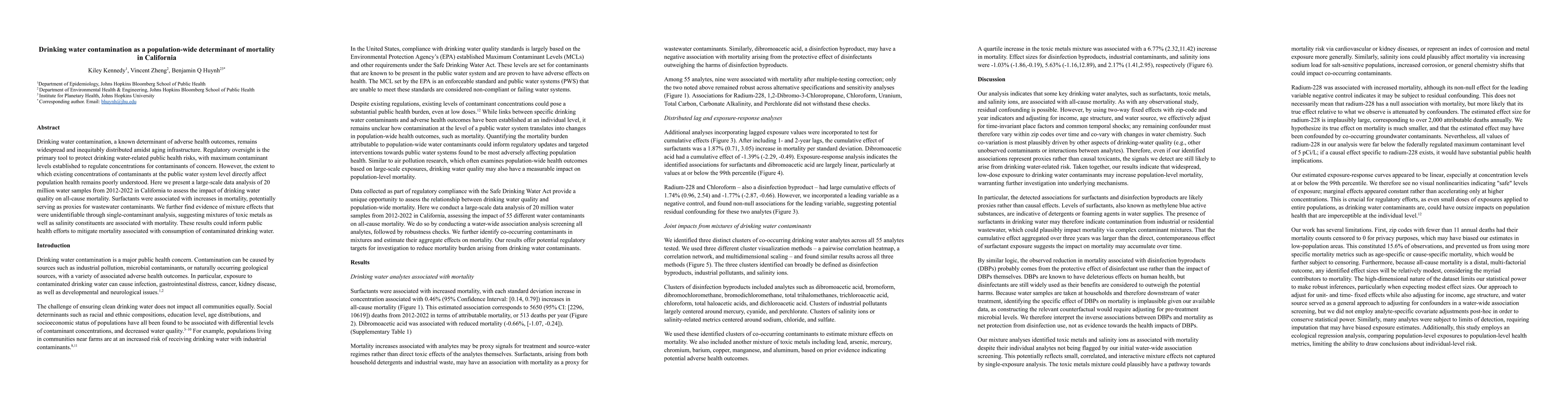 Drinking water contamination, a known determinant of adverse health outcomes, remains widespread and inequitably distributed amidst aging infrastructure. Regulatory oversight is the primary tool to protect drinking water-related public health risks, with maximum contaminant levels established to regulate concentrations for contaminants of concern. However, the extent to which existing concentrations of contaminants at the public water system level directly affect population health remains poorly understood. Here we present a large-scale data analysis of 20 million water samples from 2012-2022 in California to assess the impact of drinking water quality on all-cause mortality. Surfactants were associated with increases in mortality, potentially serving as proxies for wastewater contaminants. We further find evidence of mixture effects that were unidentifiable through single-contaminant analysis, suggesting mixtures of toxic metals as well as salinity constituents are associated with mortality. These results could inform public health efforts to mitigate mortality associated with consumption of contaminated drinking water.