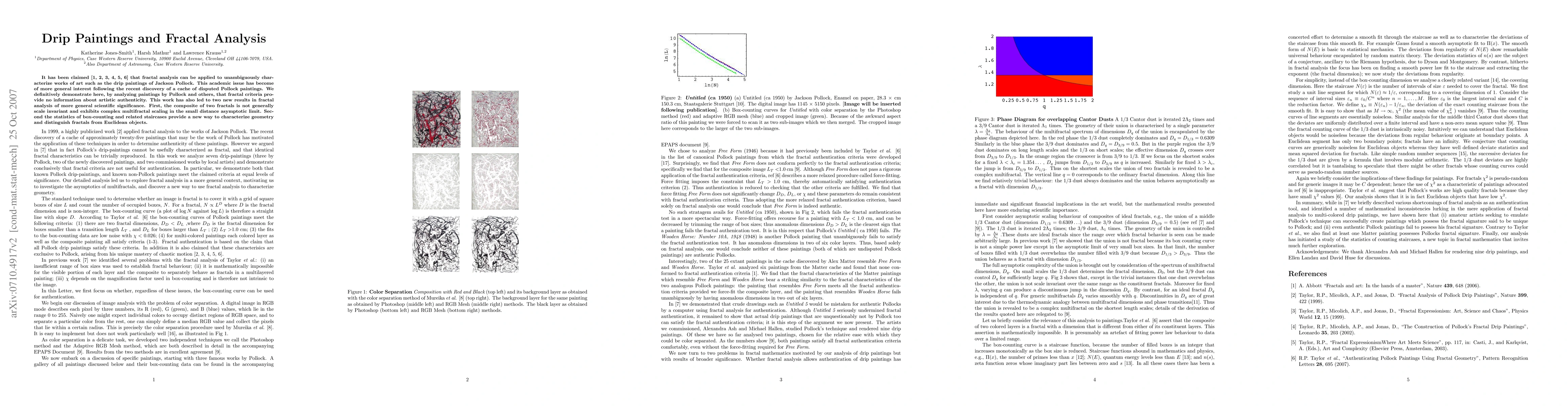 This paper demonstrates that fractal analysis cannot determine the authenticity of Jackson Pollock's drip paintings, despite previous claims. It also reveals that the composite of two fractals does not maintain scale invariance and introduces a new method using box-counting statistics to distinguish fractals from Euclidean objects.