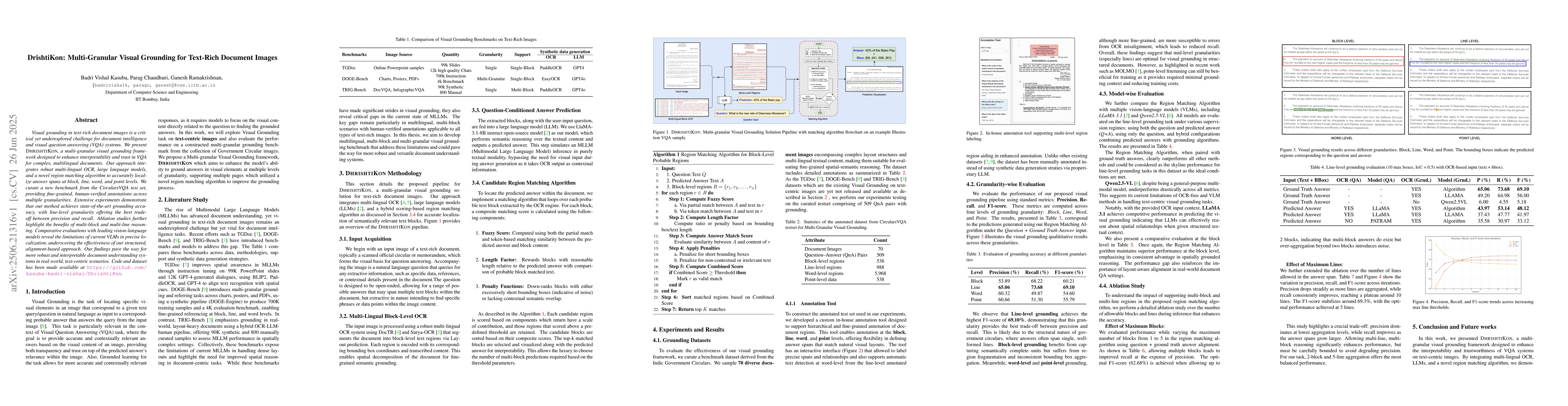 Visual grounding in text-rich document images is a critical yet underexplored challenge for document intelligence and visual question answering (VQA) systems. We present \drishtikon, a multi-granular visual grounding framework designed to enhance interpretability and trust in VQA for complex, multilingual documents. Our approach integrates robust multi-lingual OCR, large language models, and a novel region matching algorithm to accurately localize answer spans at block, line, word, and point levels. We curate a new benchmark from the CircularsVQA test set, providing fine-grained, human-verified annotations across multiple granularities. Extensive experiments demonstrate that our method achieves state-of-the-art grounding accuracy, with line-level granularity offering the best trade-off between precision and recall. Ablation studies further highlight the benefits of multi-block and multi-line reasoning. Comparative evaluations with leading vision-language models reveal the limitations of current VLMs in precise localization, underscoring the effectiveness of our structured, alignment-based approach. Our findings pave the way for more robust and interpretable document understanding systems in real-world, text-centric scenarios. Code and dataset has been made available at https://github.com/kasuba-badri-vishal/DhrishtiKon.