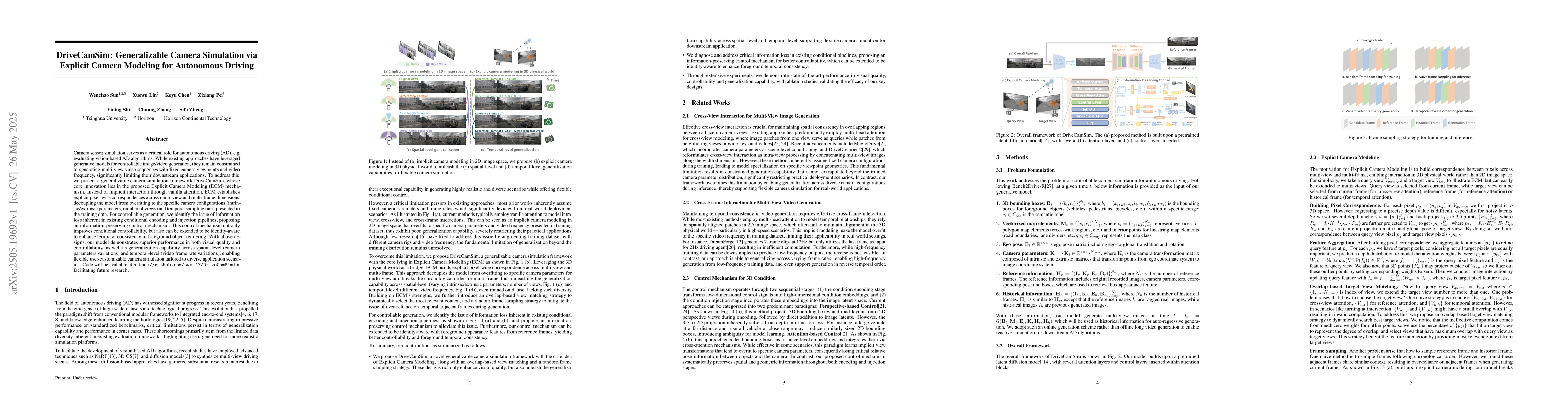 The research introduces DriveCamSim, a generalizable camera simulation framework that utilizes Explicit Camera Modeling (ECM) for establishing pixel-wise correspondences across multi-view and multi-frame dimensions, decoupling the model from overfitting to specific camera configurations and temporal sampling rates.