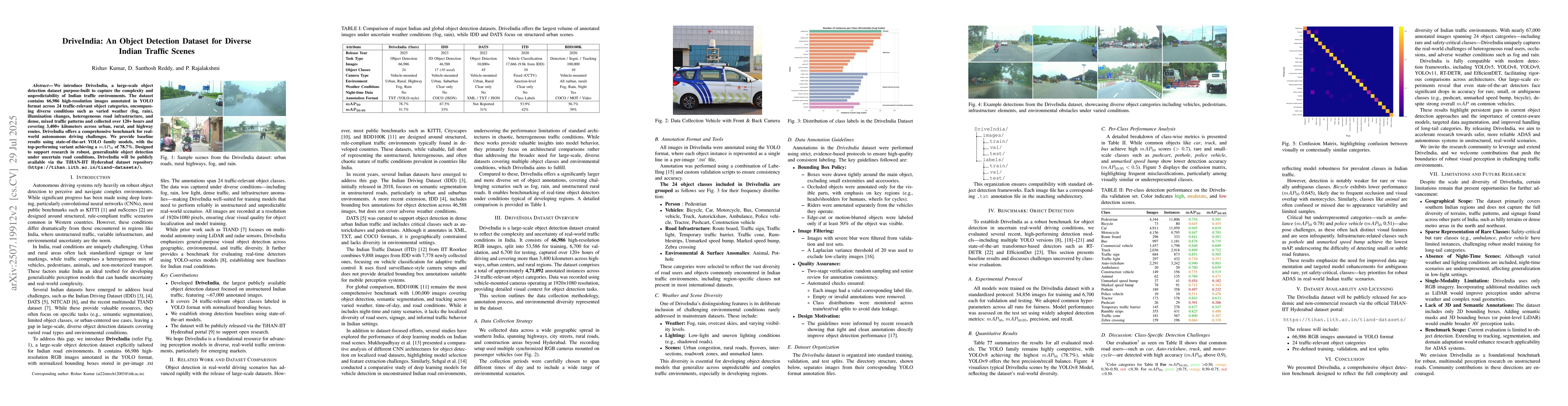 We introduce \textbf{DriveIndia}, a large-scale object detection dataset purpose-built to capture the complexity and unpredictability of Indian traffic environments. The dataset contains \textbf{66,986 high-resolution images} annotated in YOLO format across \textbf{24 traffic-relevant object categories}, encompassing diverse conditions such as varied weather (fog, rain), illumination changes, heterogeneous road infrastructure, and dense, mixed traffic patterns and collected over \textbf{120+ hours} and covering \textbf{3,400+ kilometers} across urban, rural, and highway routes. DriveIndia offers a comprehensive benchmark for real-world autonomous driving challenges. We provide baseline results using state-of-the-art \textbf{YOLO family models}, with the top-performing variant achieving a $mAP_{50}$ of \textbf{78.7\%}. Designed to support research in robust, generalizable object detection under uncertain road conditions, DriveIndia will be publicly available via the TiHAN-IIT Hyderabad dataset repository (https://tihan.iith.ac.in/tiand-datasets/).
