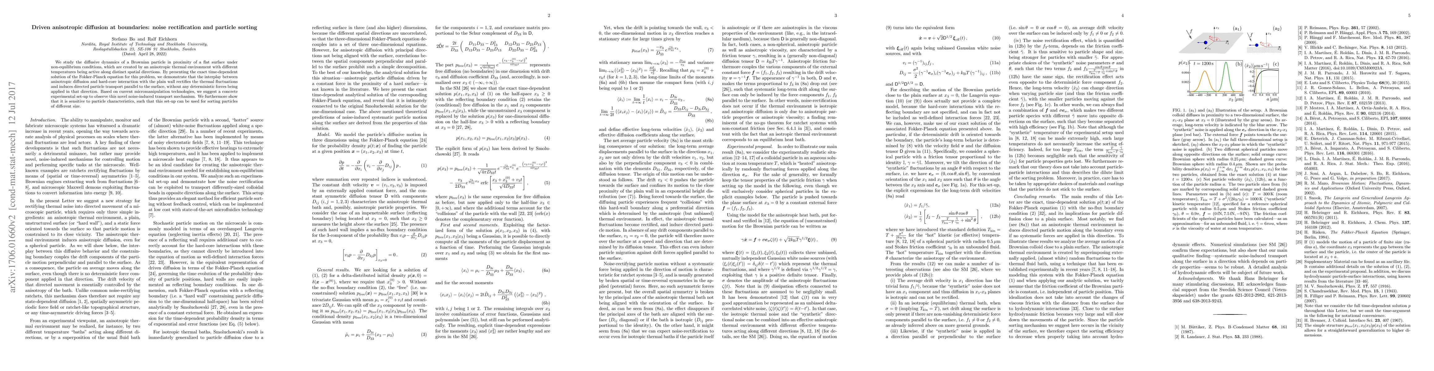 We study the diffusive dynamics of a Brownian particle in proximity of a flat surface under non-equilibrium conditions, which are created by an anisotropic thermal environment with different temperatures being active along distinct spatial directions. By presenting the exact time-dependent solution of the Fokker-Planck equation for this problem, we demonstrate that the interplay between anisotropic diffusion and hard-core interaction with the plain wall rectifies the thermal fluctuations and induces directed particle transport parallel to the surface, without any deterministic forces being applied in that direction. Based on current micromanipulation technologies, we suggest a concrete experimental set-up to observe this novel noise-induced transport mechanism. We furthermore show that it is sensitive to particle characteristics, such that this set-up can be used for sorting particles of different size.