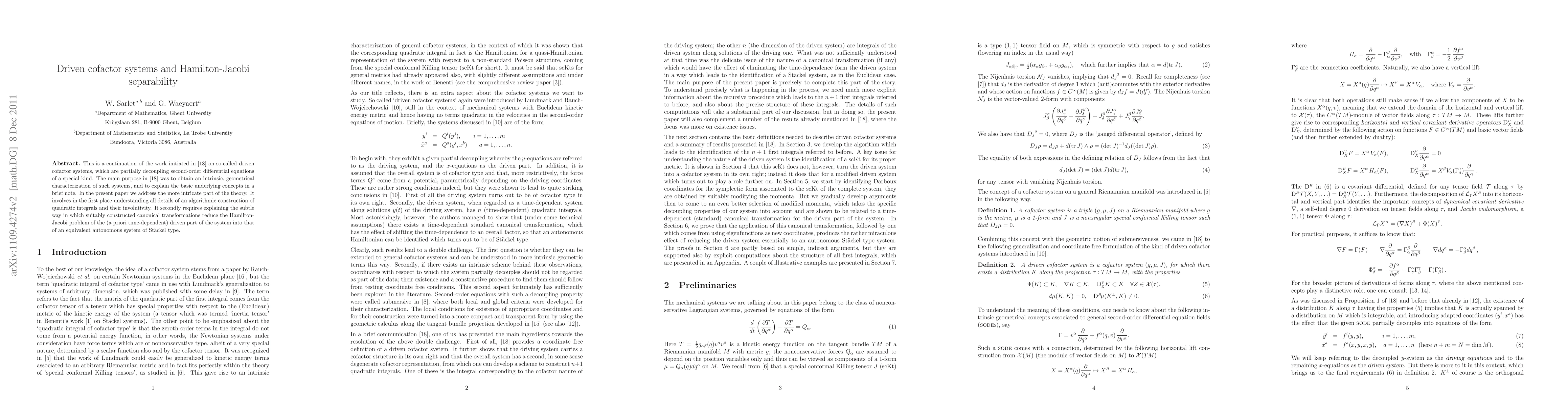 This is a continuation of the work initiated in a previous paper on so-called driven cofactor systems, which are partially decoupling second-order differential equations of a special kind. The main purpose in that paper was to obtain an intrinsic, geometrical characterization of such systems, and to explain the basic underlying concepts in a brief note. In the present paper we address the more intricate part of the theory. It involves in the first place understanding all details of an algorithmic construction of quadratic integrals and their involutivity. It secondly requires explaining the subtle way in which suitably constructed canonical transformations reduce the Hamilton-Jacobi problem of the (a priori time-dependent) driven part of the system into that of an equivalent autonomous system of St\"ackel type.