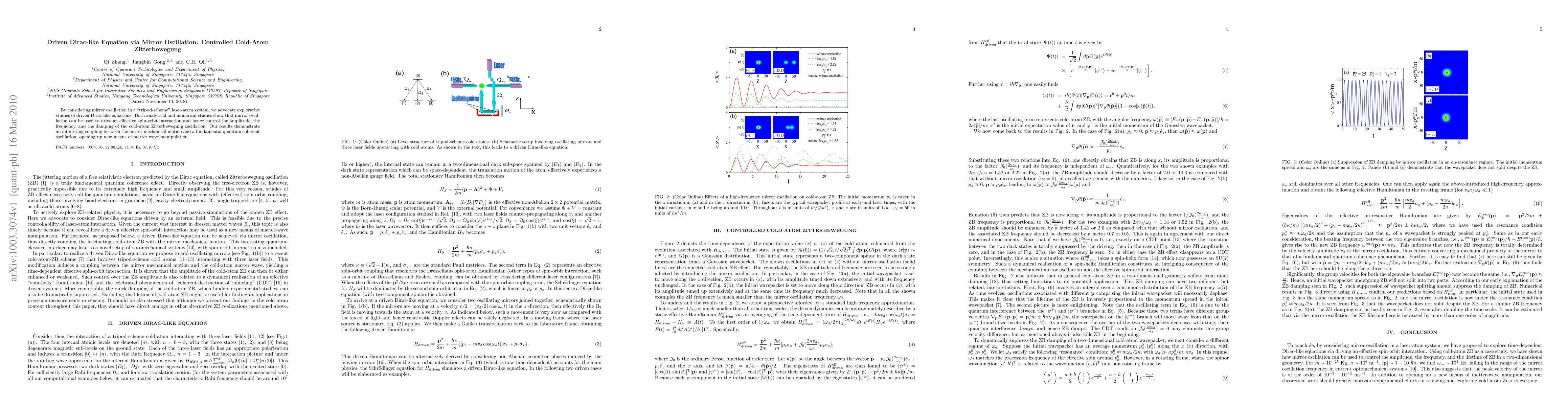 This paper explores driven Dirac-like equations through mirror oscillation in a tripod-scheme laser-atom system, demonstrating control over cold-atom Zitterbewegung. The study reveals a coupling between mirror motion and quantum coherent oscillations, offering new methods for matter wave manipulation.