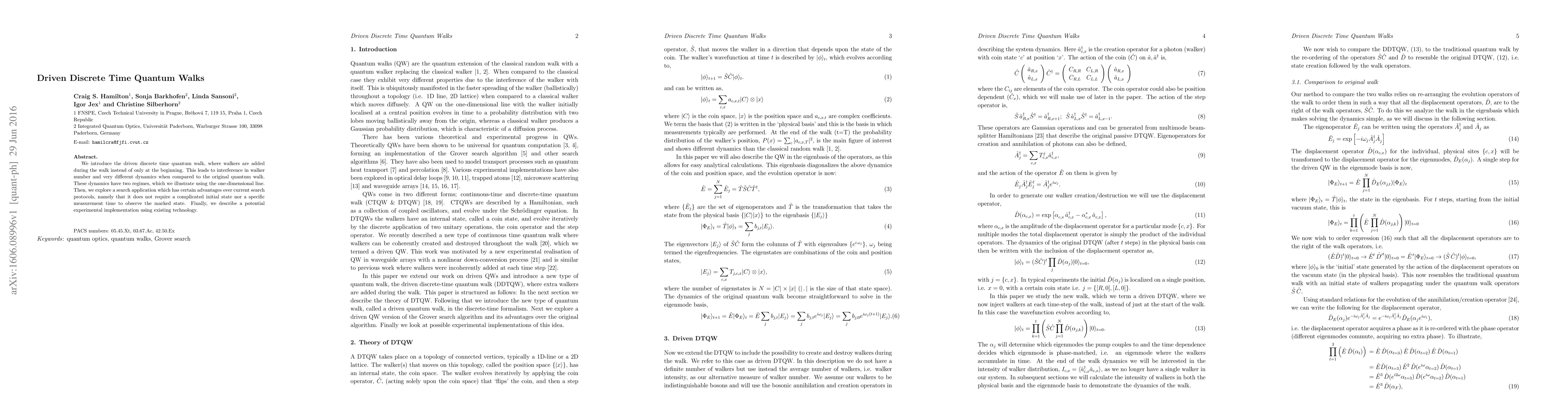 We introduce the driven discrete time quantum walk, where walkers are added during the walk instead of only at the beginning. This leads to interference in walker number and very different dynamics when compared to the original quantum walk. These dynamics have two regimes, which we illustrate using the one-dimensional line. Then, we explore a search application which has certain advantages over current search protocols, namely that it does not require a complicated initial state nor a specific measurement time to observe the marked state. Finally, we describe a potential experimental implementation using existing technology.