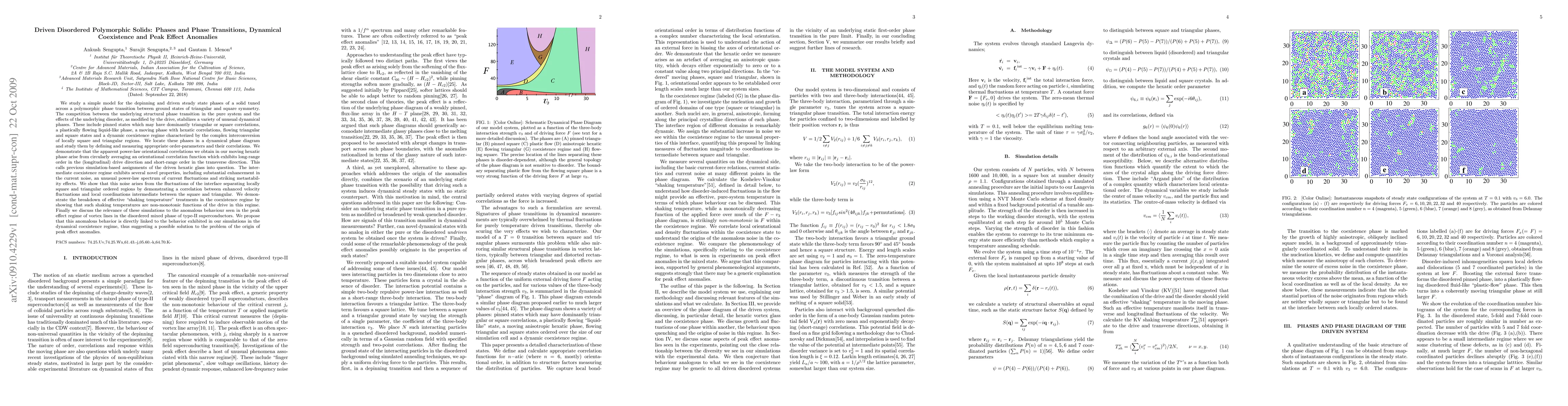 This paper investigates a model of driven disordered solids undergoing polymorphic transitions between triangular and square ground states, exploring various phases and transitions. It identifies a dynamic coexistence regime with enhanced current noise, unusual power-law current fluctuations, and metastability, proposing a link to the peak effect anomalies observed in type-II superconductors.