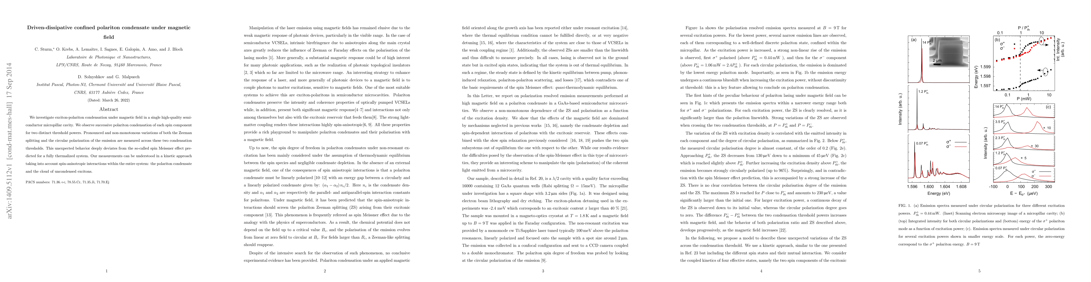 We investigate exciton-polariton condensation under magnetic field in a single high-quality semiconductor micropillar cavity. We observe successive polariton condensation of each spin component for two distinct threshold powers. Pronounced and non-monotonous variations of both the Zeeman splitting and the circular polarization of the emission are measured across these two condensation thresholds. This unexpected behavior deeply deviates from the so-called spin Meissner effect predicted for a fully thermalized system. Our measurements can be understood in a kinetic approach taking into account spin-anisotropic interactions within the entire system: the polariton condensate and the cloud of uncondensed excitons.