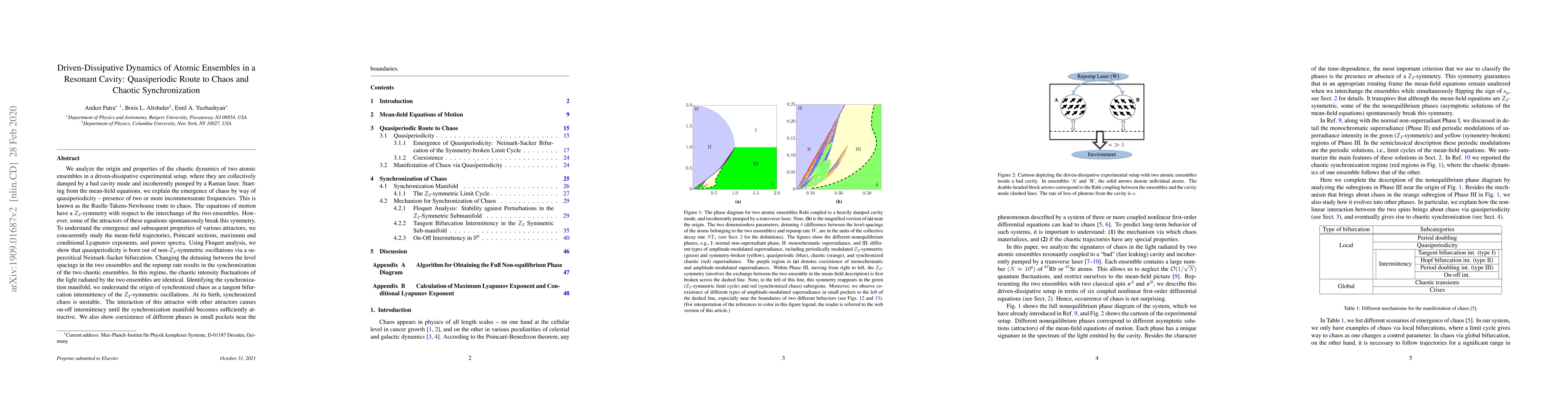 We analyze the origin and properties of the chaotic dynamics of two atomic ensembles in a driven-dissipative experimental setup, where they are collectively damped by a bad cavity mode and incoherently pumped by a Raman laser. Starting from the mean-field equations, we explain the emergence of chaos by way of quasiperiodicity -- presence of two or more incommensurate frequencies. This is known as the Ruelle-Takens-Newhouse route to chaos. The equations of motion have a $\mathbb{Z}_{2}$-symmetry with respect to the interchange of the two ensembles. However, some of the attractors of these equations spontaneously break this symmetry. To understand the emergence and subsequent properties of various attractors, we concurrently study the mean-field trajectories, Poincar\'{e} sections, maximum and conditional Lyapunov exponents, and power spectra. Using Floquet analysis, we show that quasiperiodicity is born out of non $\mathbb{Z}_{2}$-symmetric oscillations via a supercritical Neimark-Sacker bifurcation. Changing the detuning between the level spacings in the two ensembles and the repump rate results in the synchronization of the two chaotic ensembles. In this regime, the chaotic intensity fluctuations of the light radiated by the two ensembles are identical. Identifying the synchronization manifold, we understand the origin of synchronized chaos as a tangent bifurcation intermittency of the $\mathbb{Z}_{2}$-symmetric oscillations. At its birth, synchronized chaos is unstable. The interaction of this attractor with other attractors causes on-off intermittency until the synchronization manifold becomes sufficiently attractive. We also show coexistence of different phases in small pockets near the boundaries.