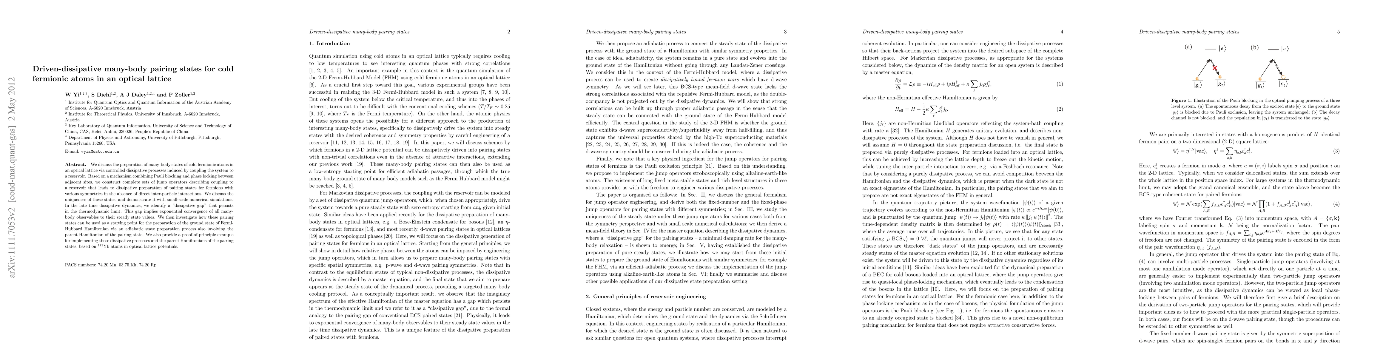 This paper explores the creation of many-body pairing states in cold fermionic atoms using dissipative processes in optical lattices, demonstrating a "dissipative gap" that ensures exponential convergence to steady states. It also outlines a method for preparing the ground state of the Fermi-Hubbard model via adiabatic state preparation, with a proof-of-principle example using Yb171 atoms.