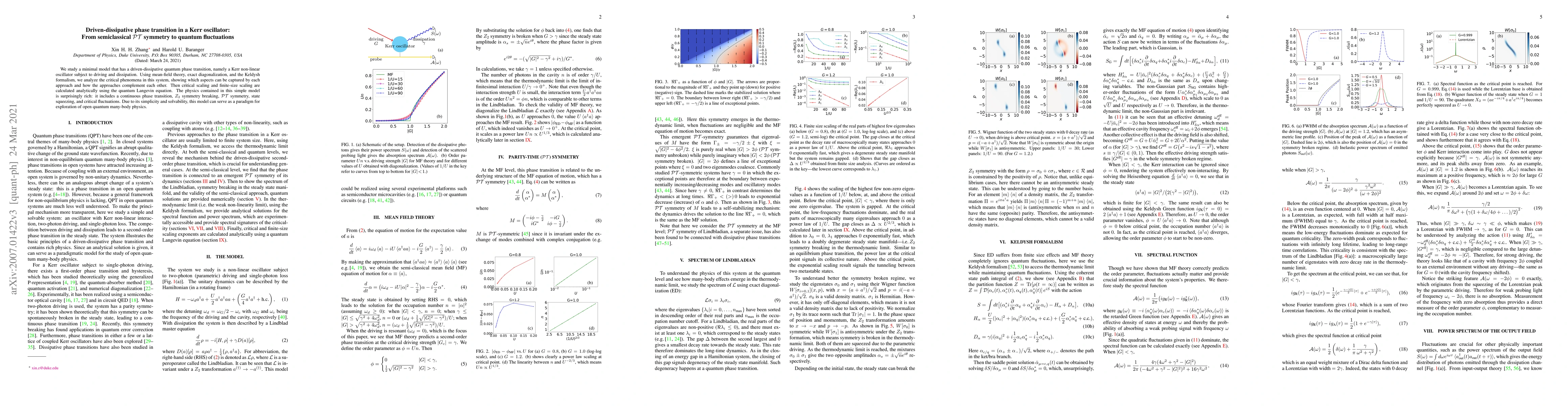 This paper explores the driven-dissipative quantum phase transition in a Kerr oscillator, analyzing critical phenomena using mean-field theory, exact diagonalization, and the Keldysh formalism. The study reveals a rich physics including $Z_{2}$ symmetry breaking, $\mathcal{PT}$ symmetry, and critical fluctuations, demonstrating the model's potential as a paradigm for open quantum many-body systems.