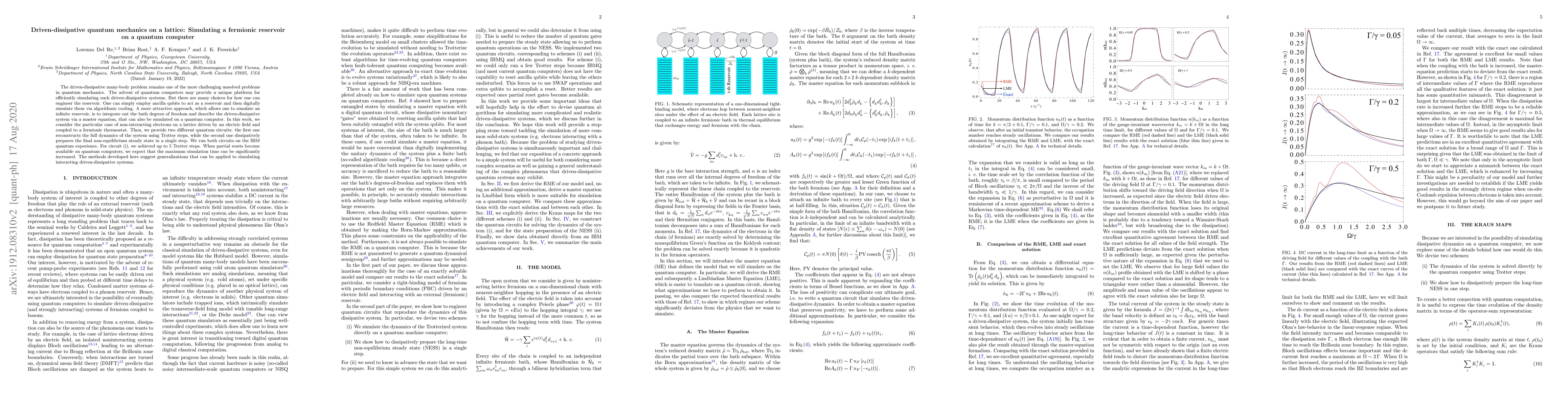 The driven-dissipative many-body problem remains one of the most challenging unsolved problems in quantum mechanics. The advent of quantum computers may provide a unique platform for efficiently simulating such driven-dissipative systems. But there are many choices for how one can engineer the reservoir. One can simply employ ancilla qubits to act as a reservoir and then digitally simulate them via algorithmic cooling. A more attractive approach, which allows one to simulate an infinite reservoir, is to integrate out the bath degrees of freedom and describe the driven-dissipative system via a master equation, that can also be simulated on a quantum computer. In this work, we consider the particular case of non-interacting electrons on a lattice driven by an electric field and coupled to a fermionic thermostat. Then, we provide two different quantum circuits: the first one reconstructs the full dynamics of the system using Trotter steps, while the second one dissipatively prepares the final non-equilibrium steady state in a single step. We run both circuits on the IBM quantum experience. For circuit (i), we achieved up to 5 Trotter steps. When partial resets become available on quantum computers, we expect that the maximum simulation time can be significantly increased. The methods developed here suggest generalizations that can be applied to simulating interacting driven-dissipative systems.