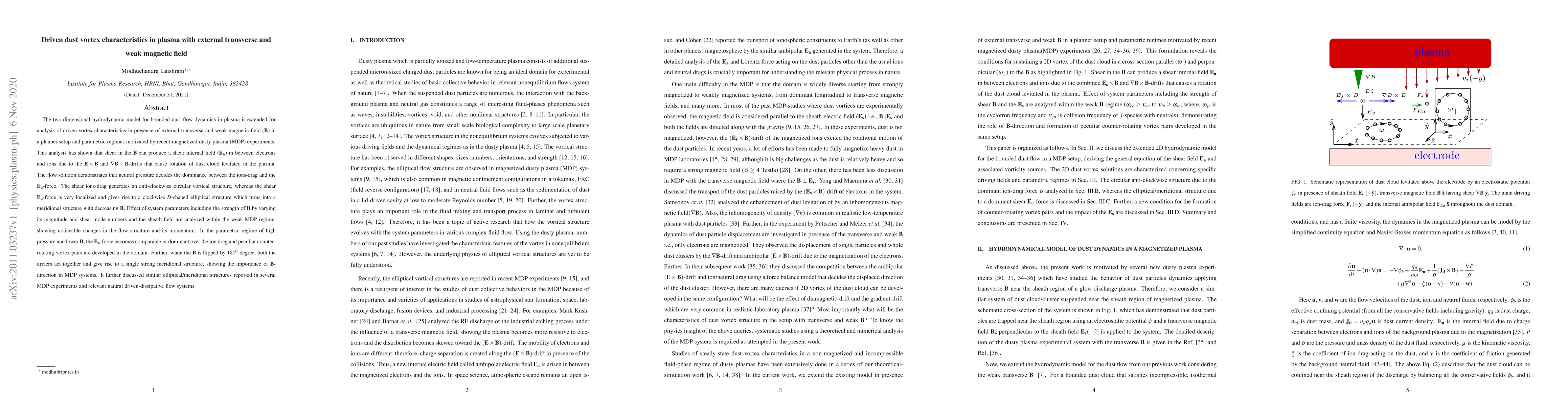 The two-dimensional hydrodynamic model for bounded dust flow dynamics in plasma is extended for analysis of driven vortex characteristics in presence of external transverse and weak magnetic field (${\bf B}$) in a planner setup and parametric regimes motivated by recent magnetized dusty plasma (MDP) experiments. This analysis has shown that shear in the ${\bf B}$ can produce a shear internal field (${\bf E_a}$) in between electrons and ions due to the ${\bf E}\times {\bf B}$ and ${\nabla {\bf B}}\times {\bf B}$-drifts that cause rotation of dust cloud levitated in the plasma. The flow solution demonstrates that neutral pressure decides the dominance between the ions-drag and the ${\bf E_a}$-force. The shear ions-drag generates an anti-clockwise circular vortical structure, whereas the shear ${\bf E_a}$-force is very localized and gives rise to a clockwise $D$-shaped elliptical structure which turns into a meridional structure with decreasing ${\bf B}$. Effect of system parameters including the strength of ${\bf B}$ by varying its magnitude and shear mode numbers and the sheath field are analyzed within the weak MDP regime, showing noticeable changes in the flow structure and its momentum. In the parametric regime of high pressure and lower ${\bf B}$, the ${\bf E_a}$-force becomes comparable or dominant over the ion drag and peculiar counter-rotating vortex pairs are developed in the domain. Further, when the ${\bf B}$ is flipped by $180^0$-degree, both the drivers act together and give rise to a single strong meridional structure, showing the importance of ${\bf B}$-direction in MDP systems. It further discussed similar elliptical/meridional structures reported in several MDP experiments and relevant natural driven-dissipative flow systems.