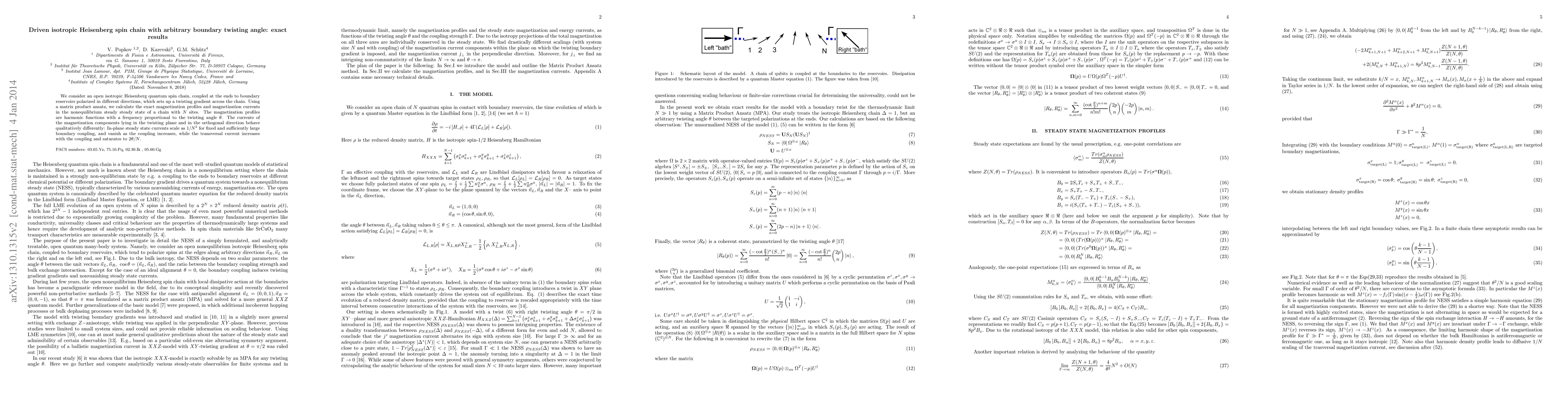 We consider an open isotropic Heisenberg quantum spin chain, coupled at the ends to boundary reservoirs polarized in different directions, which sets up a twisting gradient across the chain. Using a matrix product ansatz, we calculate the exact magnetization profiles and magnetization currents in the nonequilibrium steady steady state of a chain with N sites. The magnetization profiles are harmonic functions with a frequency proportional to the twisting angle {\theta}. The currents of the magnetization components lying in the twisting plane and in the orthogonal direction behave qualitatively differently: In-plane steady state currents scale as 1/N^2 for fixed and sufficiently large boundary coupling, and vanish as the coupling increases, while the transversal current increases with the coupling and saturates to 2{\theta}/N.