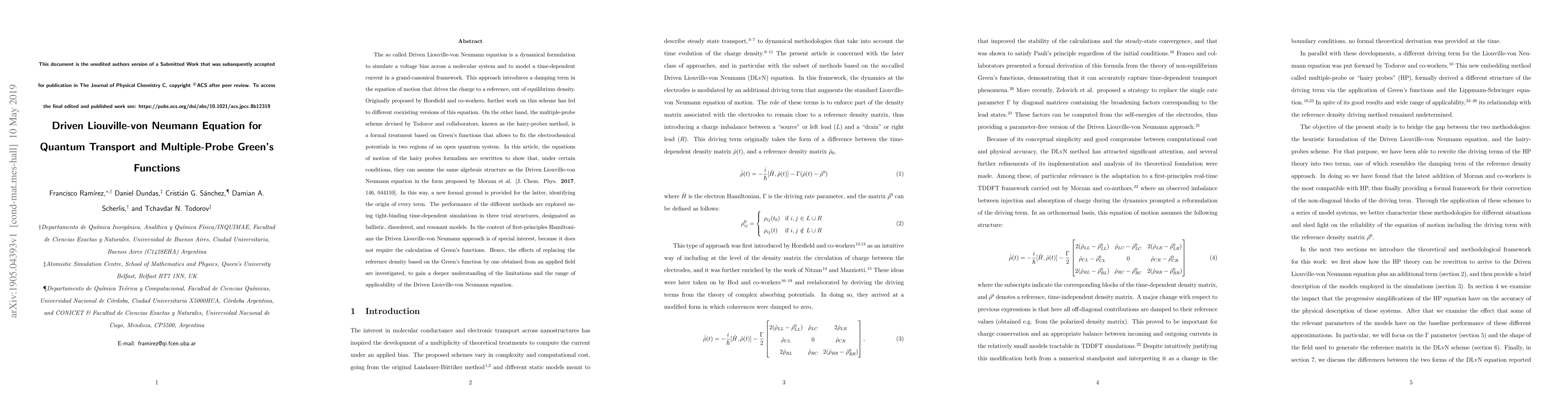 This paper explores the Driven Liouville-von Neumann equation for simulating quantum transport under voltage bias and compares it to the multiple-probe Green's functions method. It demonstrates that the equations of motion in the hairy-probes formalism can match the Driven Liouville-von Neumann equation under specific conditions, providing a new theoretical foundation.